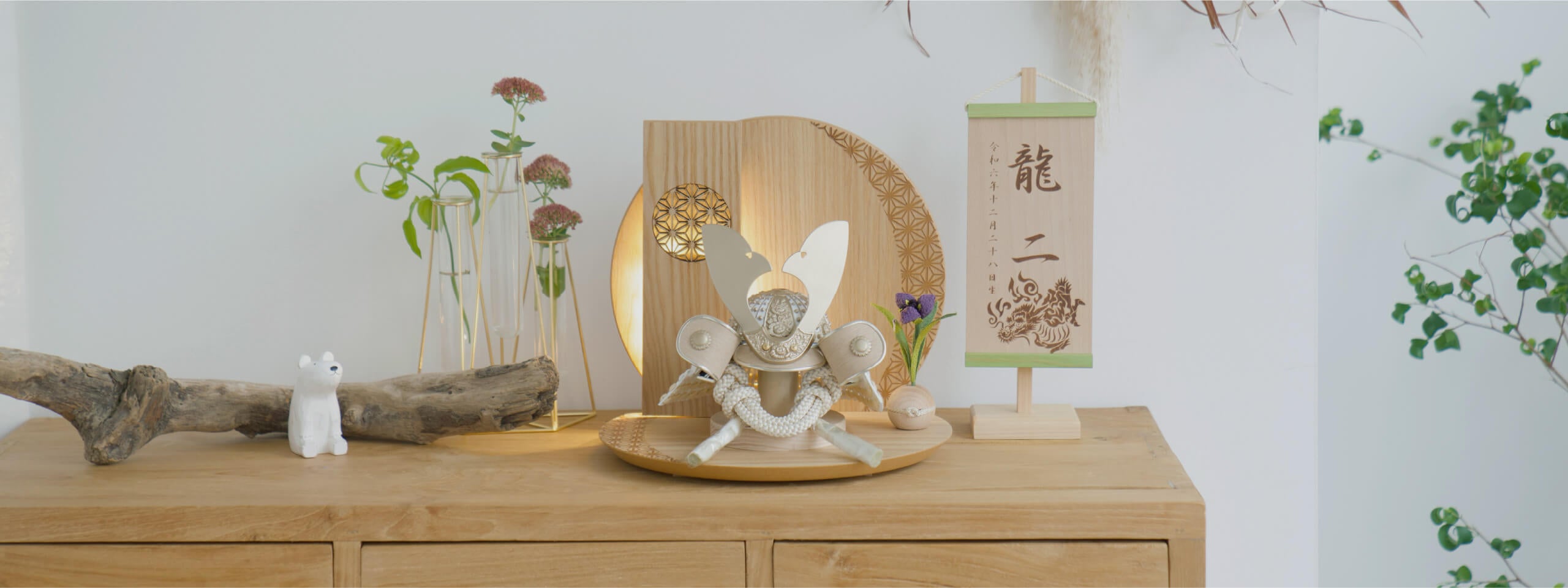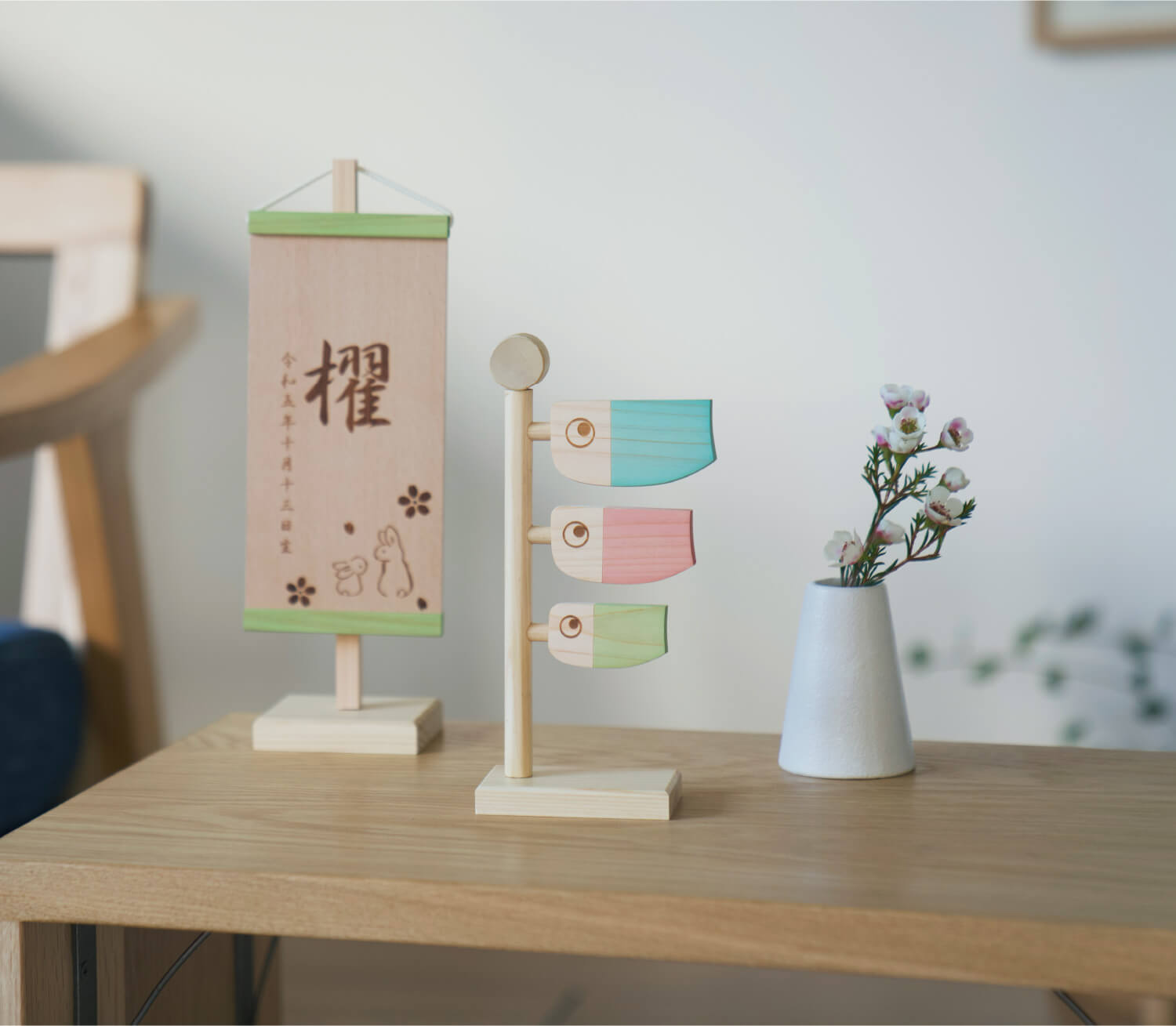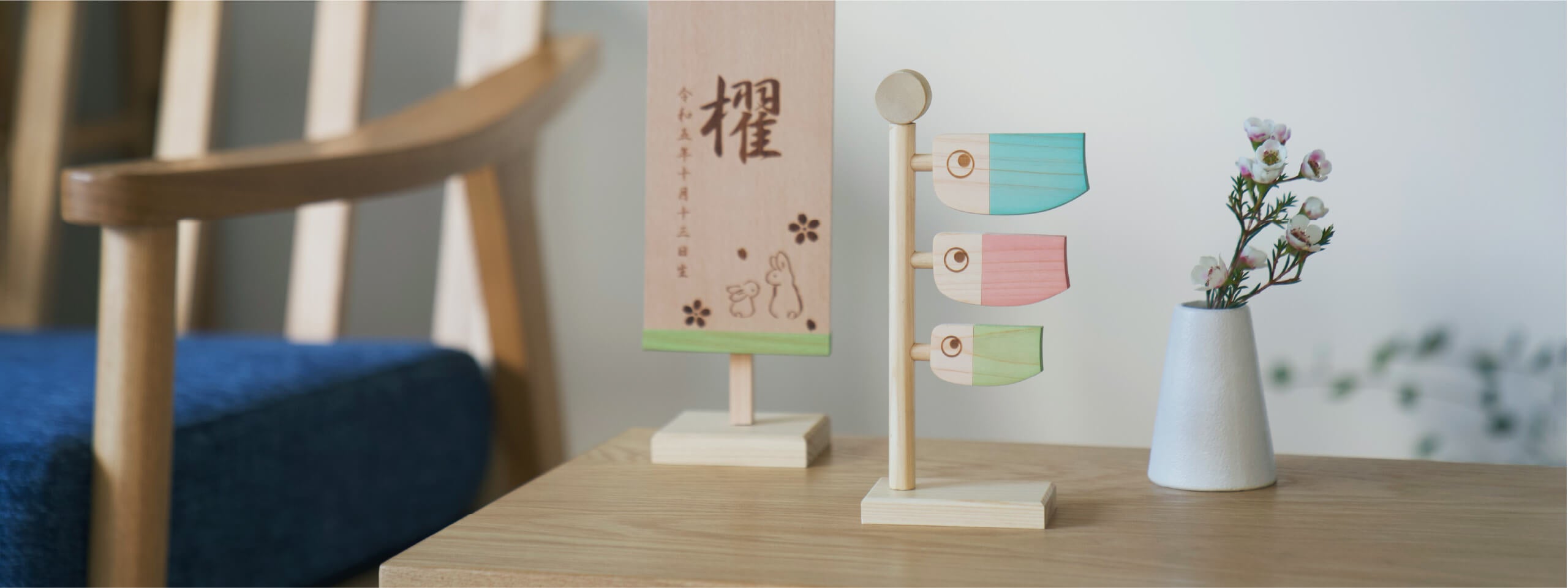 木都の節句飾りはこだわりの木材から生み出されます。木の質感や木目が感じられる木製ケースや収納箱、積み木のように遊べる木製の鯉のぼりや雛人形など、全ての商品に「国産の天然木」を使用しています。 木ならではの肌触りの良さや温かみぬくもりを感じてほしいから、厳選した木材を使用しています。