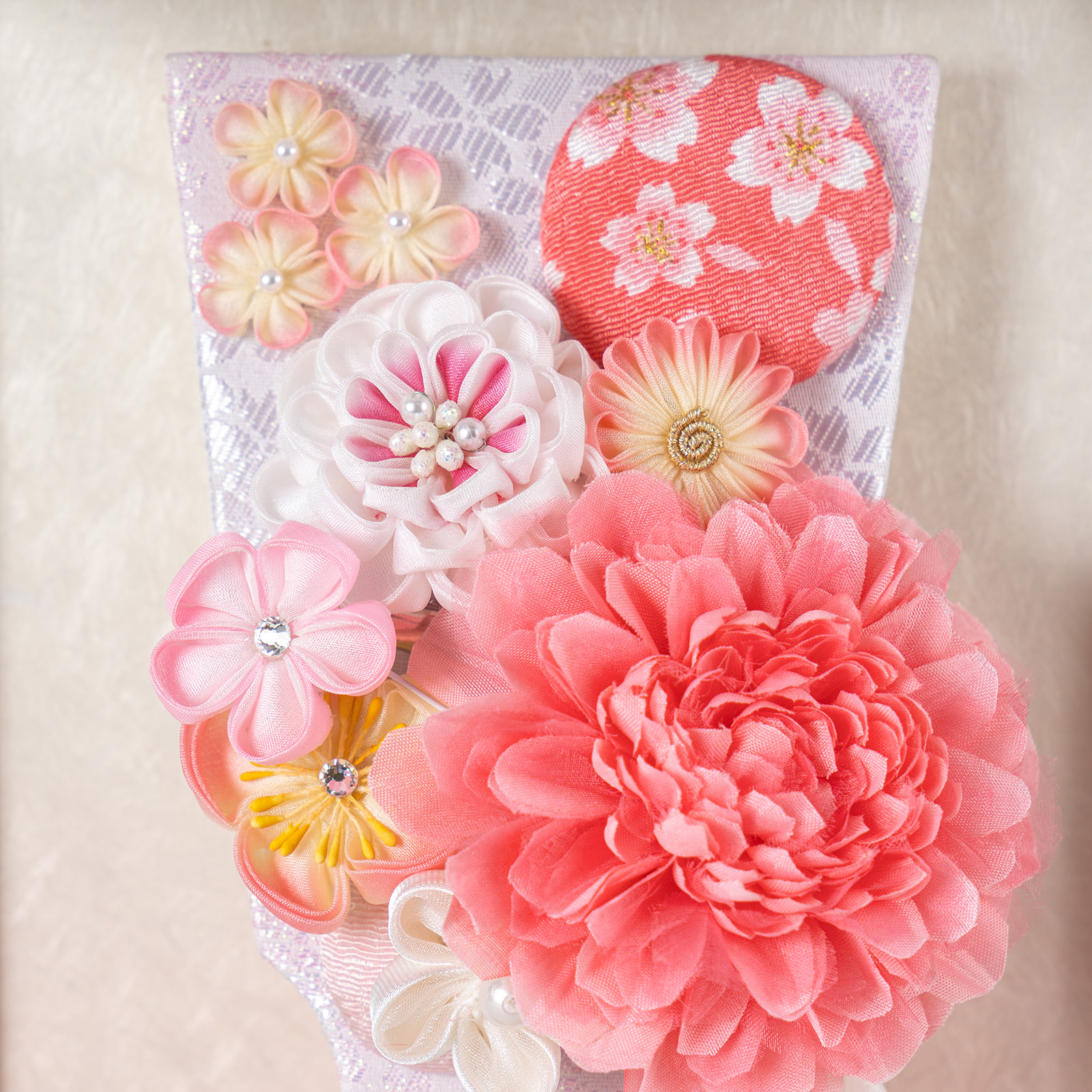 花飾りには、天然繊維の正絹を使用。軽やかで上品な光沢があり、着物にも用いられる高級素材です。