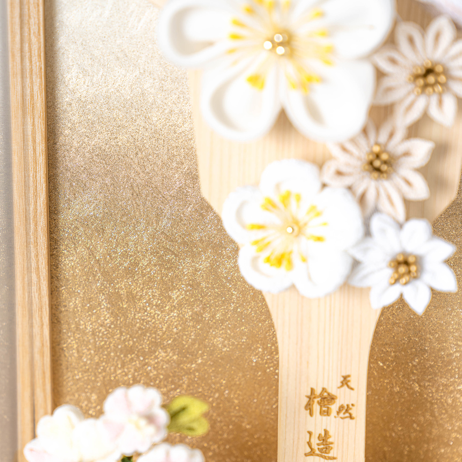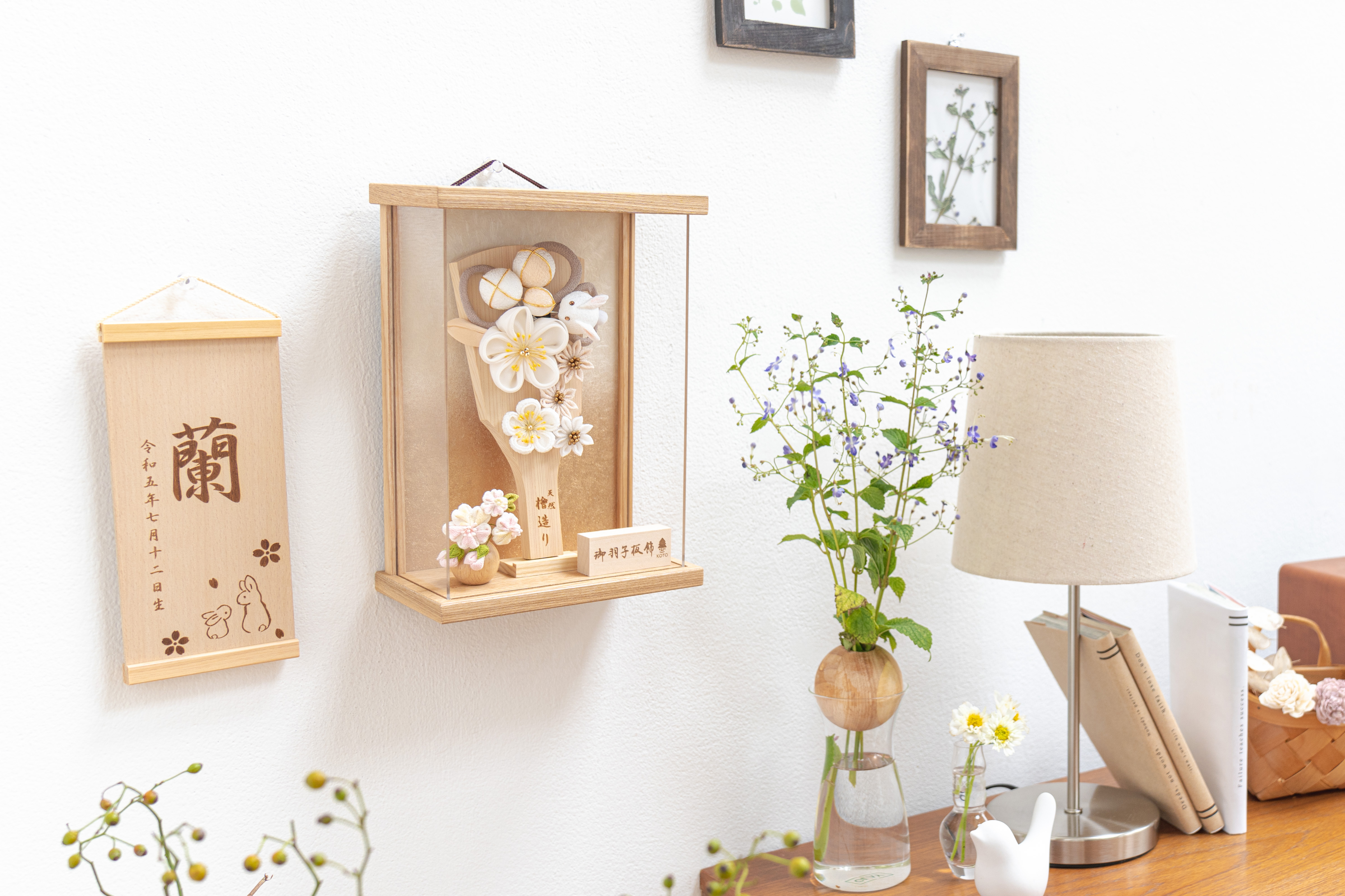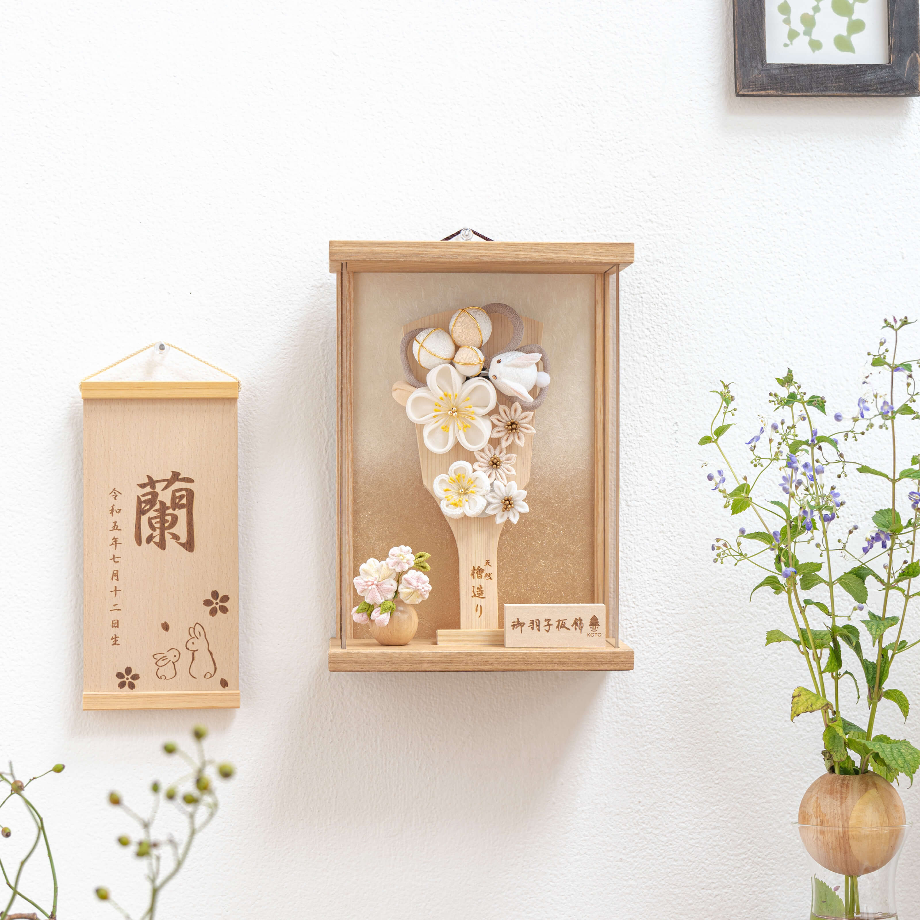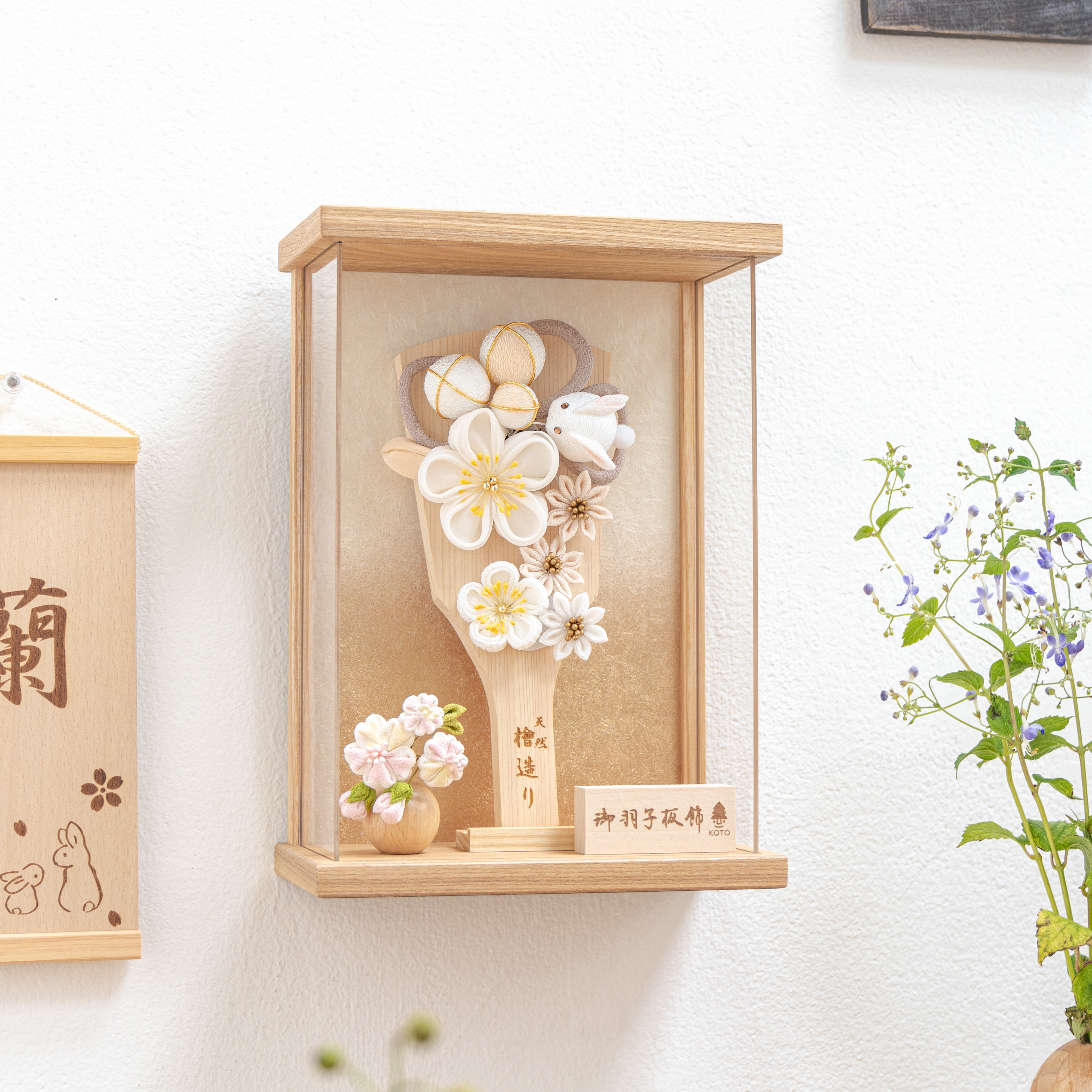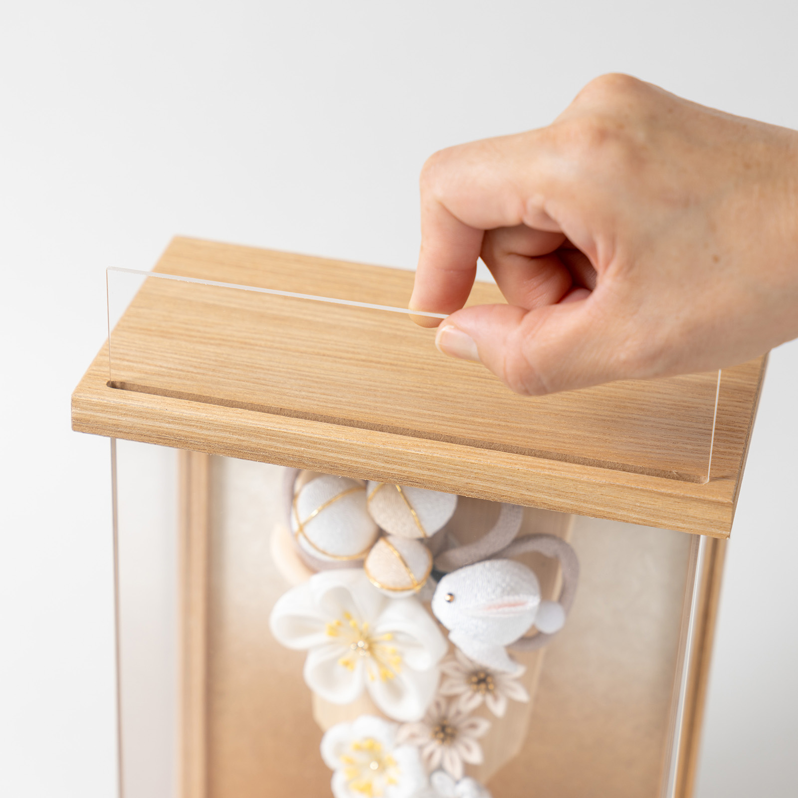 一般的なケース飾りの羽子板はケースを丸ごと取り外すタイプのものが多いですが、木都の羽子板は平置きでも壁掛けでもデザイン性を損なわずに質感を楽しんでいただくため、前面アクリル板を取り外せるようになっています。