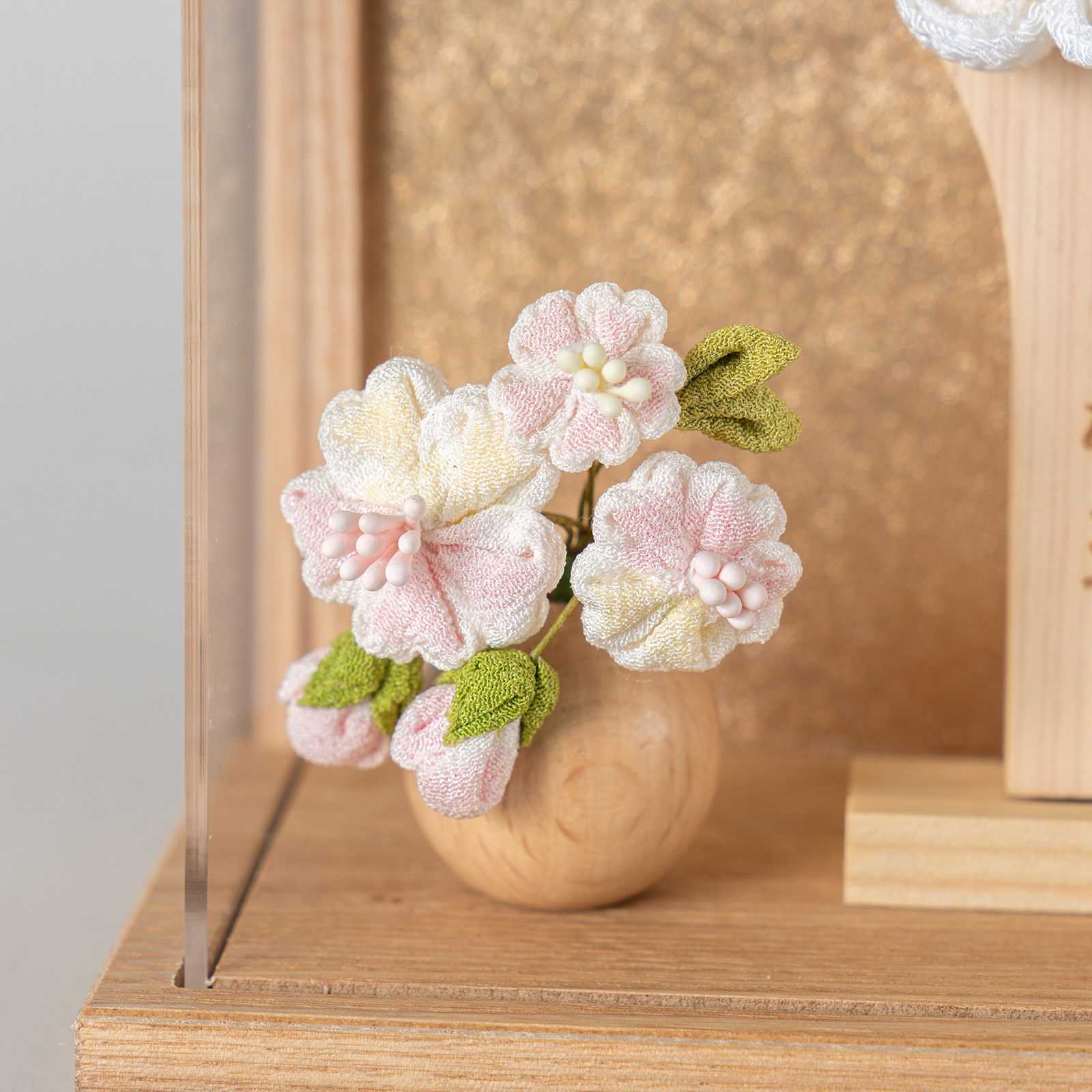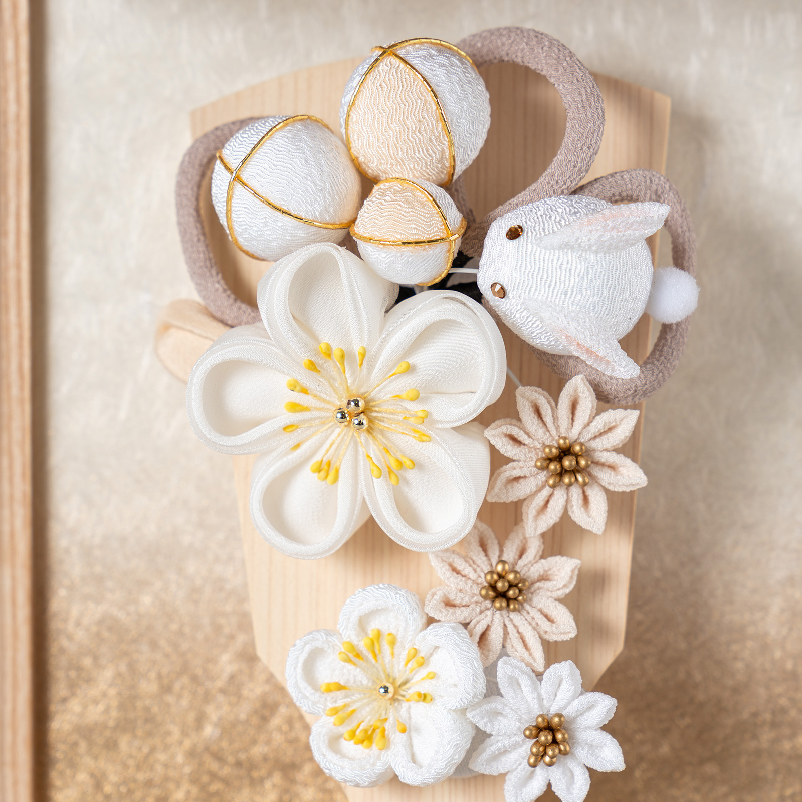 花飾りには、天然繊維の正絹を使用。軽やかで上品な光沢があり、着物にも用いられる高級素材です。