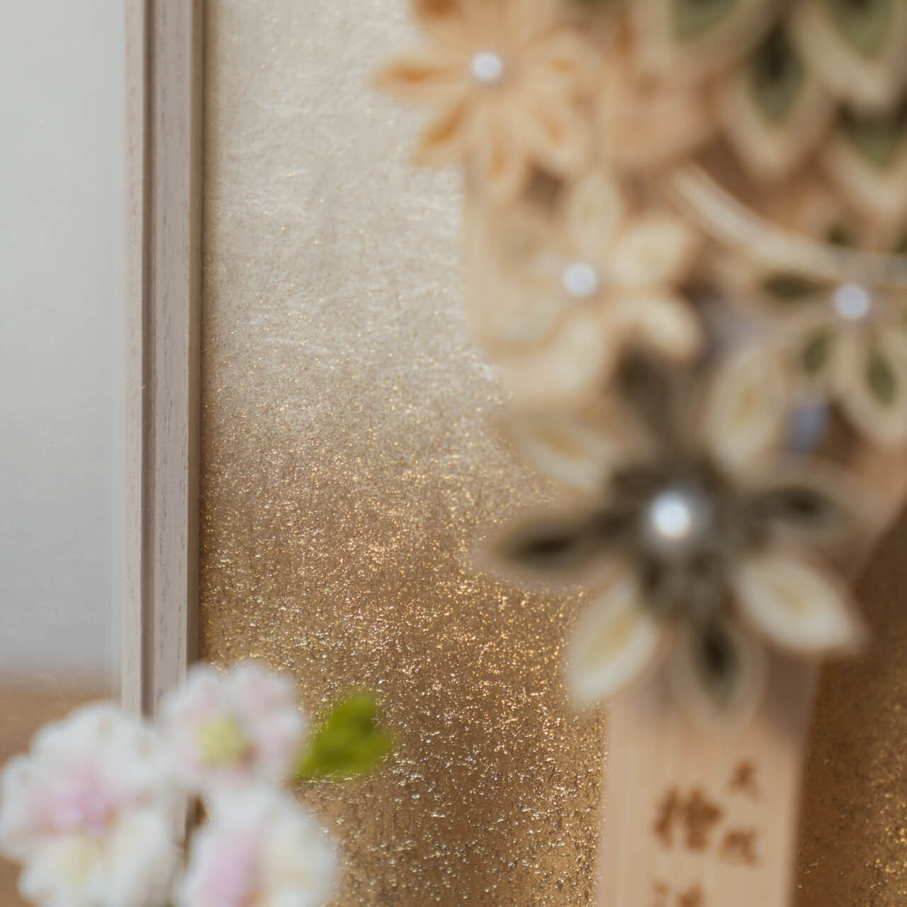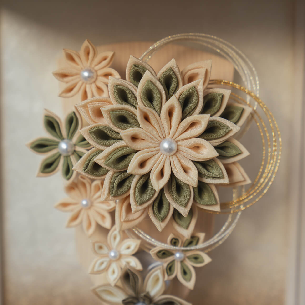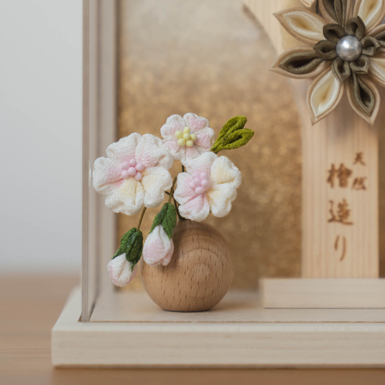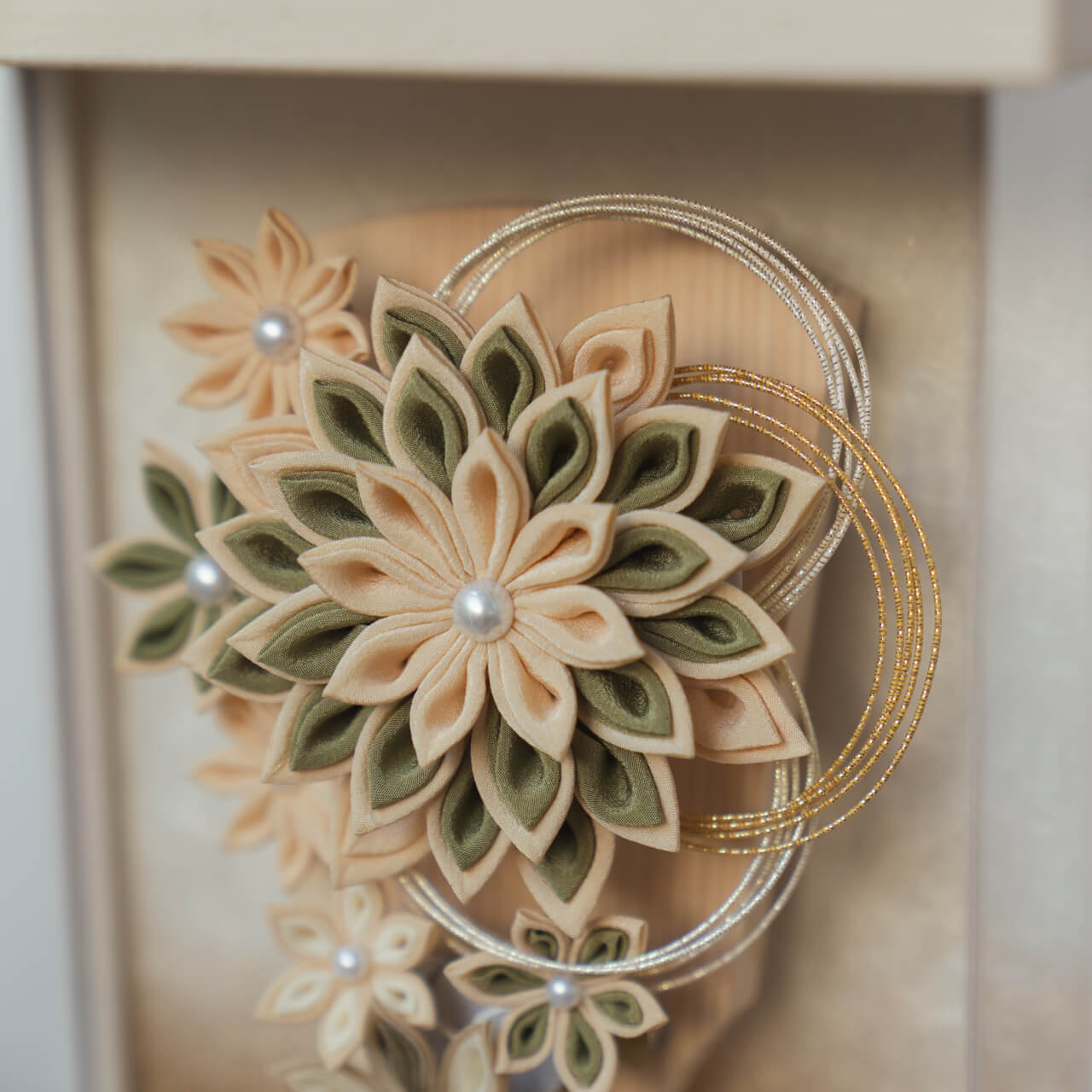 花飾りには、天然繊維の正絹を使用。軽やかで上品な光沢があり、着物にも用いられる高級素材です。