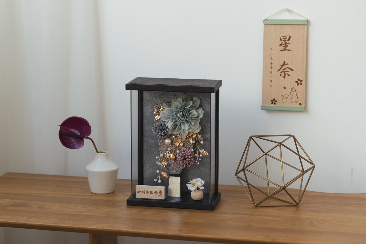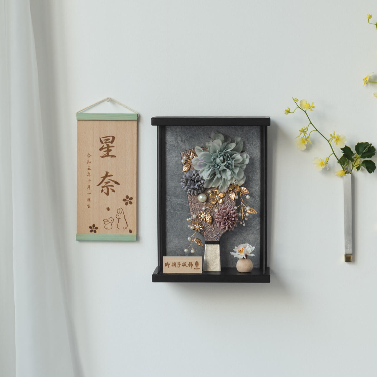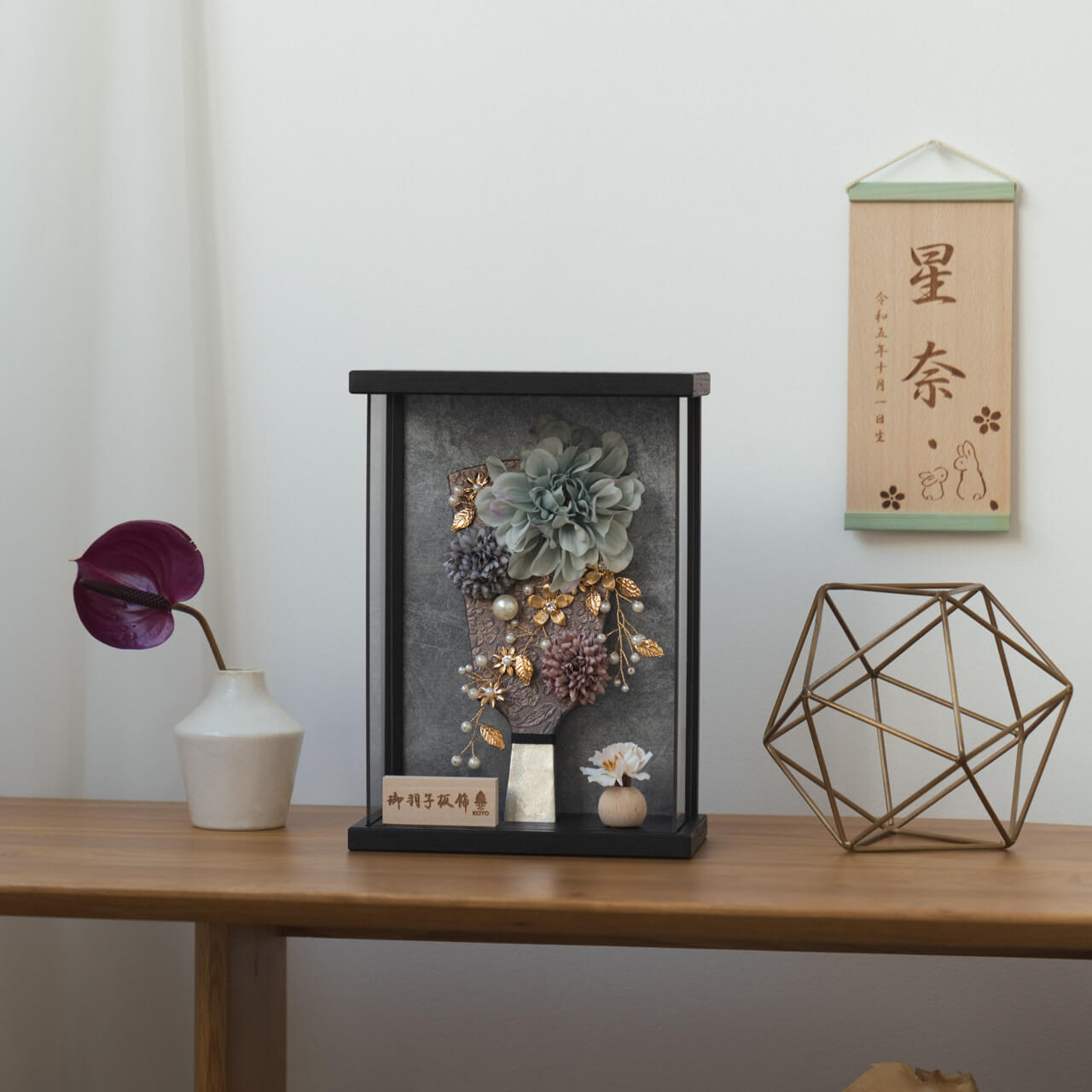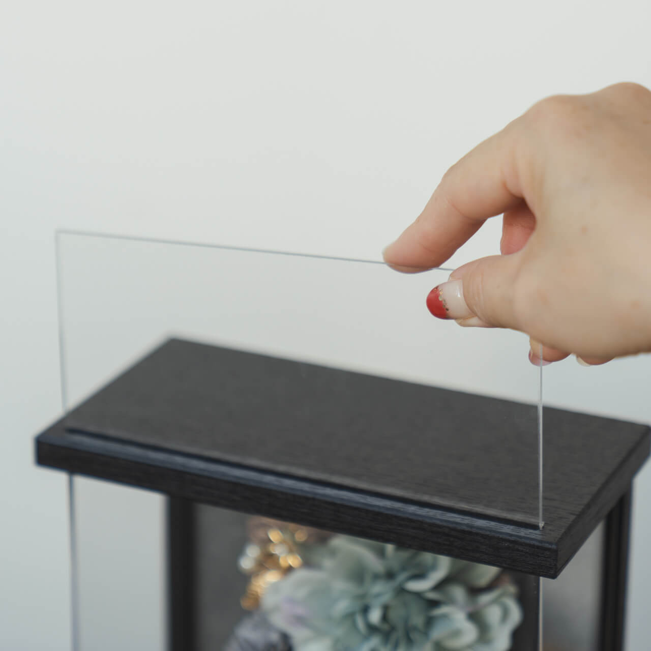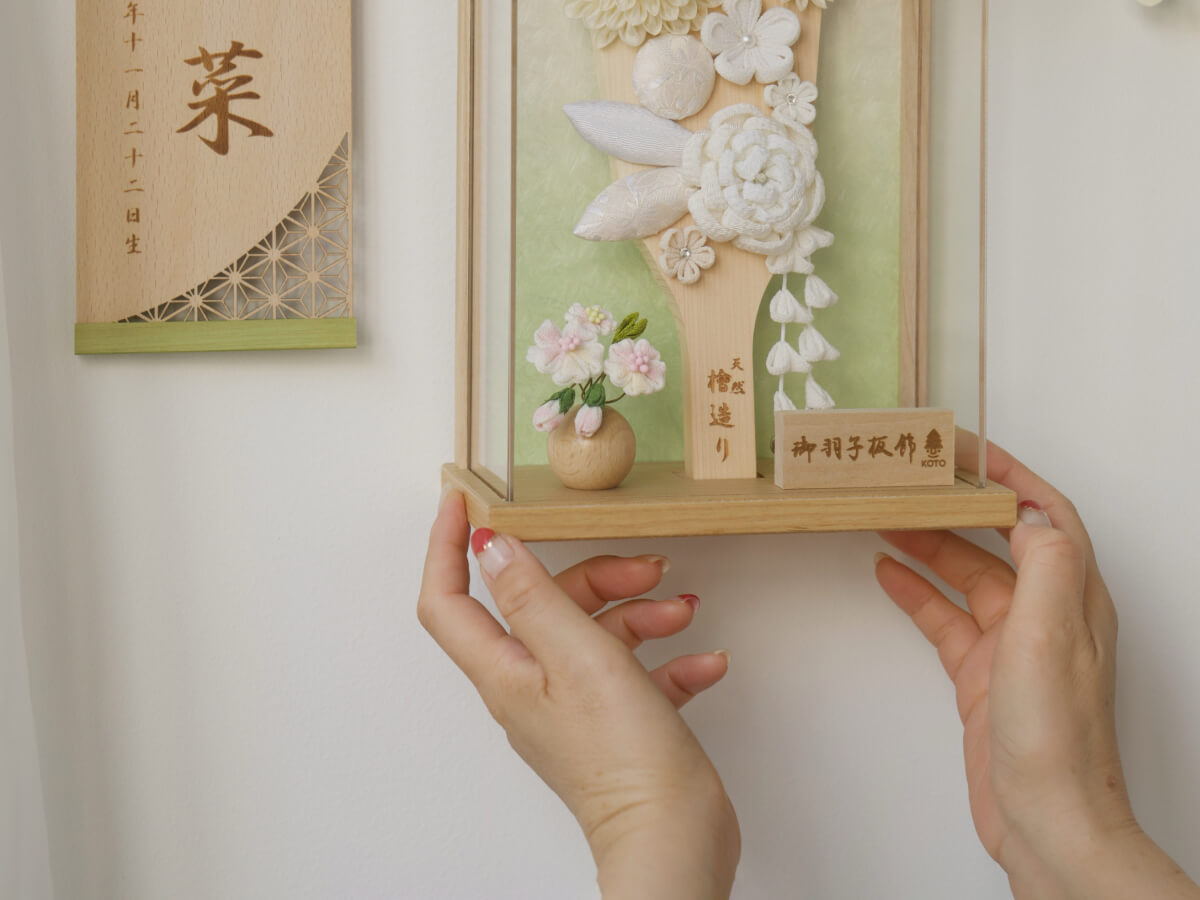 一般的なケース飾りの羽子板はケースを丸ごと取り外すタイプのものが多いですが、木都の羽子板は平置きでも壁掛けでもデザイン性を損なわずに質感を楽しんでいただくため、前面アクリル板を取り外せるようになっています。