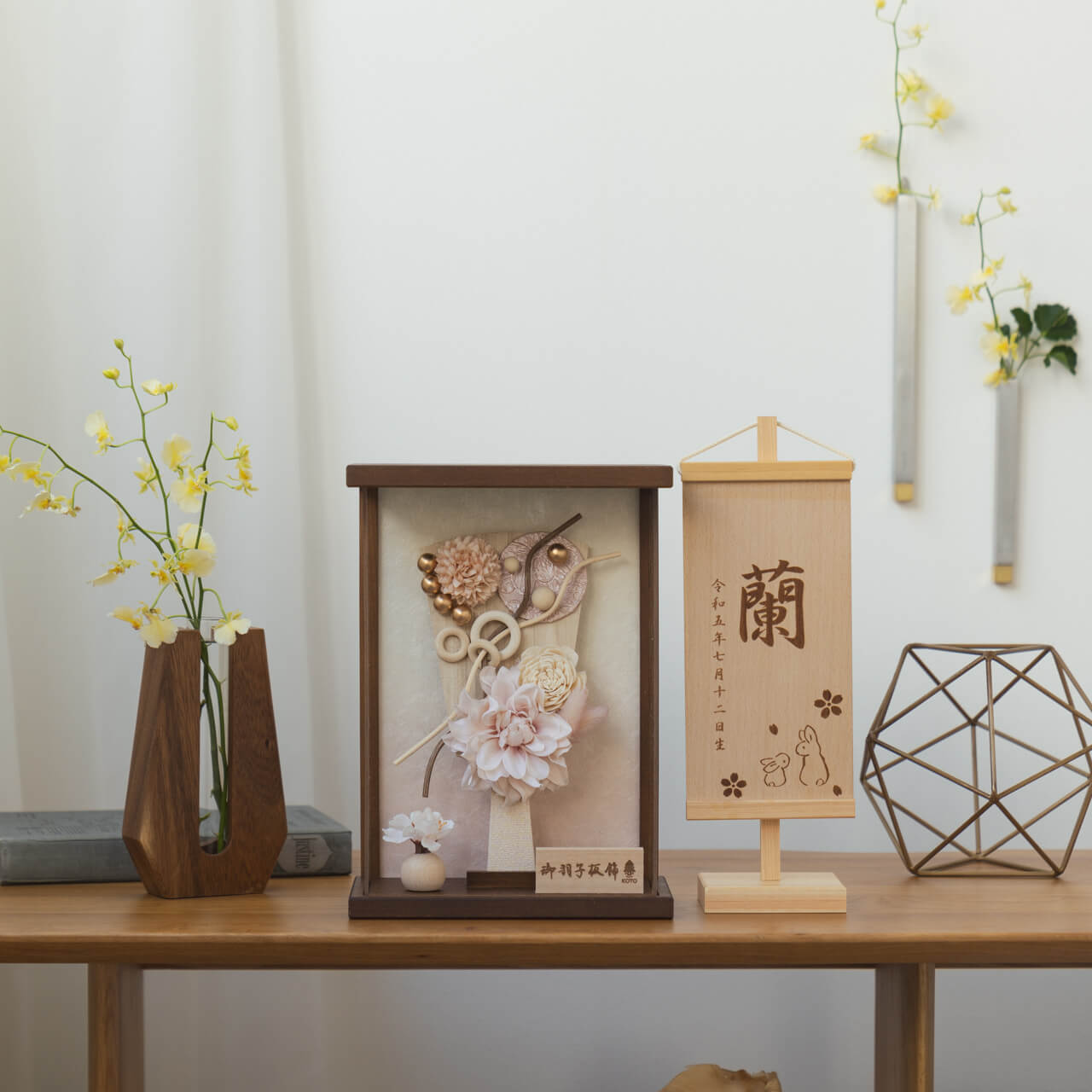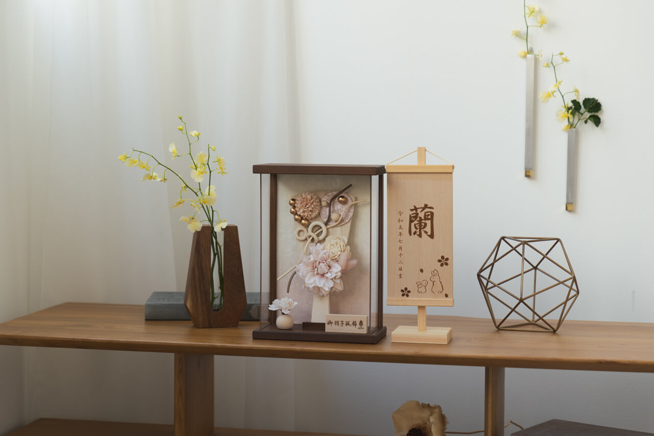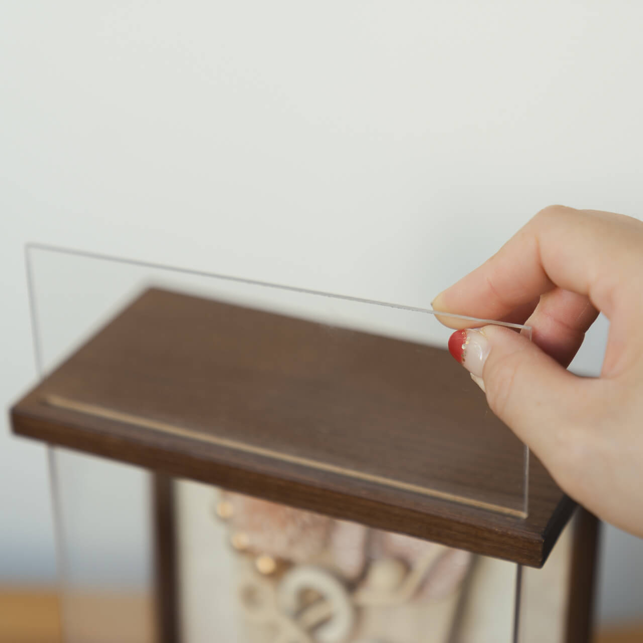 一般的なケース飾りの羽子板はケースを丸ごと取り外すタイプのものが多いですが、木都の羽子板は平置きでも壁掛けでもデザイン性を損なわずに質感を楽しんでいただくため、前面アクリル板を取り外せるようになっています。