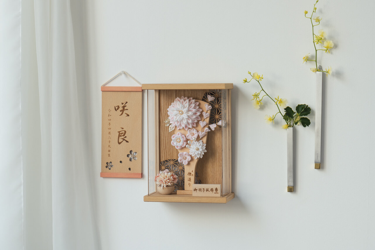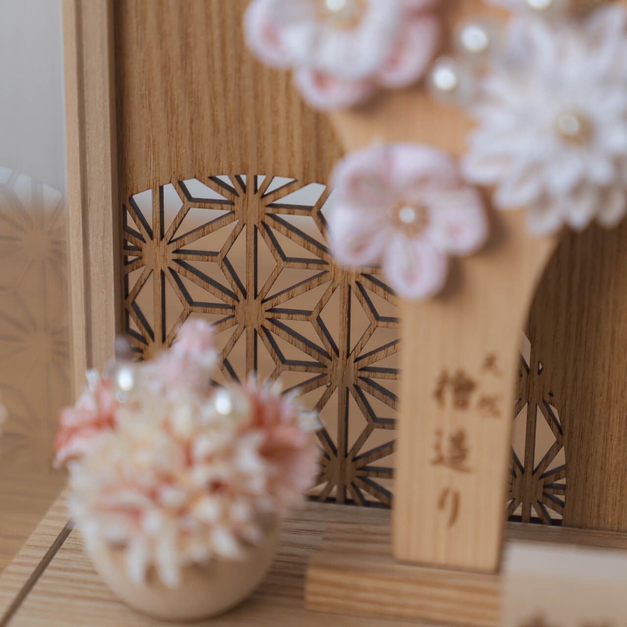 一般的なケース飾りの羽子板はケースを丸ごと取り外すタイプのものが多いですが、木都の羽子板は平置きでも壁掛けでもデザイン性を損なわずに質感を楽しんでいただくため、前面アクリル板を取り外せるようになっています。
