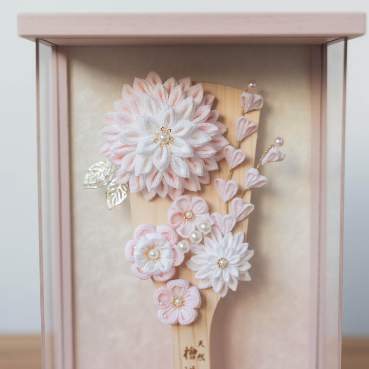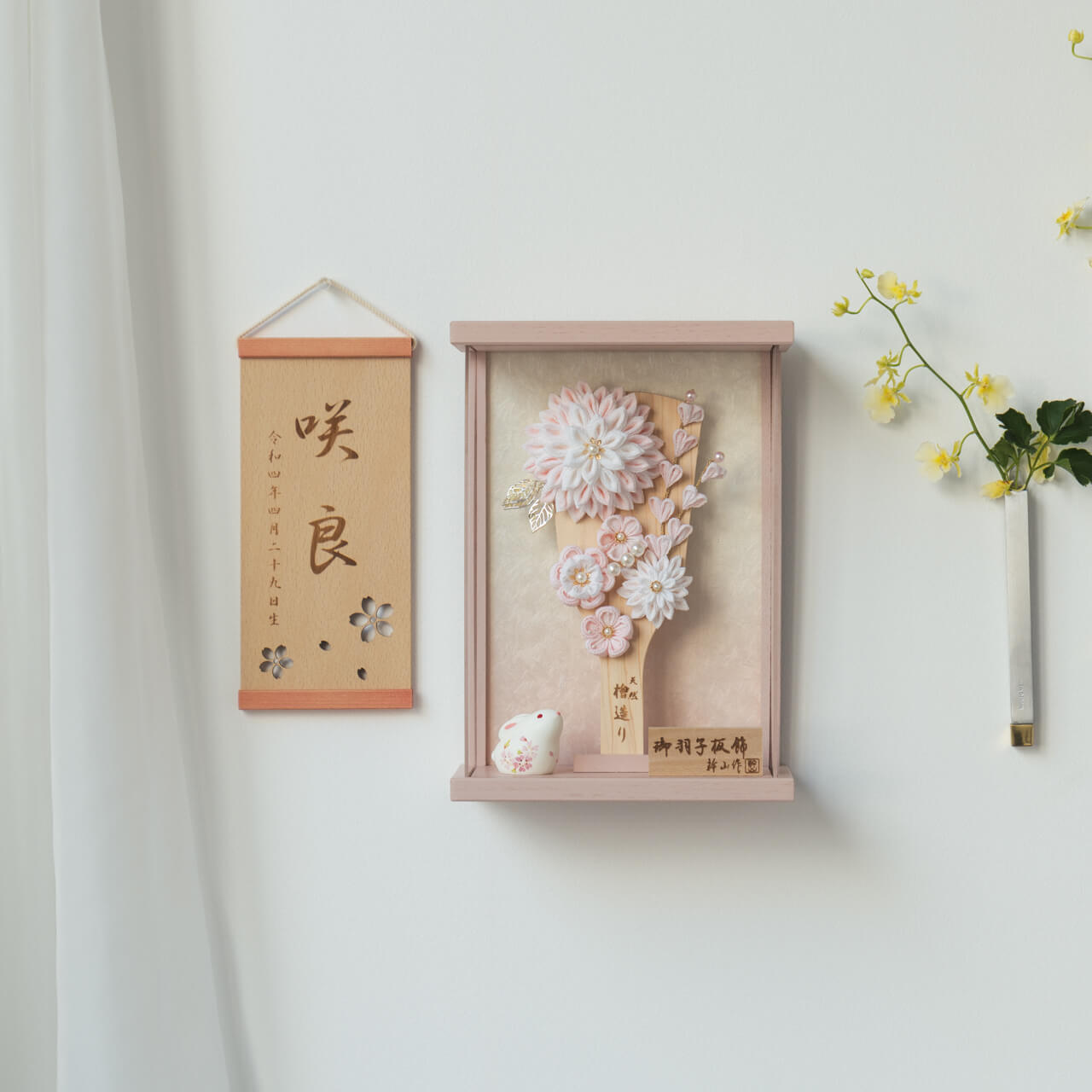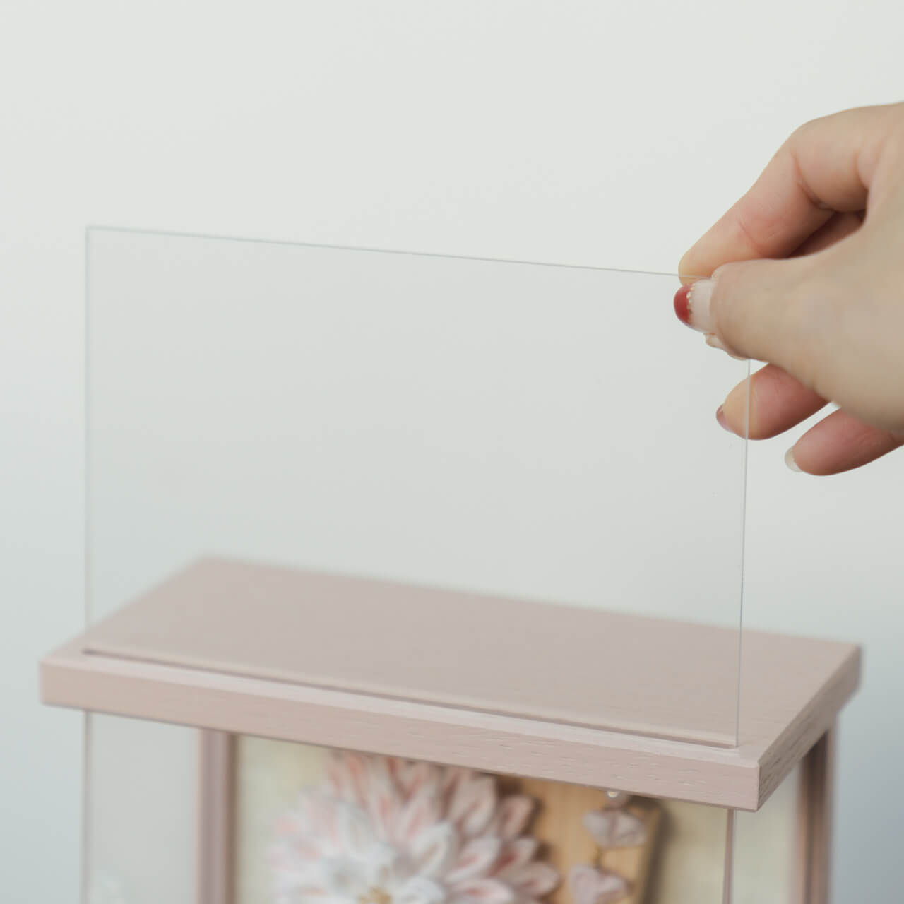 一般的なケース飾りの羽子板はケースを丸ごと取り外すタイプのものが多いですが、木都の羽子板は平置きでも壁掛けでもデザイン性を損なわずに質感を楽しんでいただくため、前面アクリル板を取り外せるようになっています。