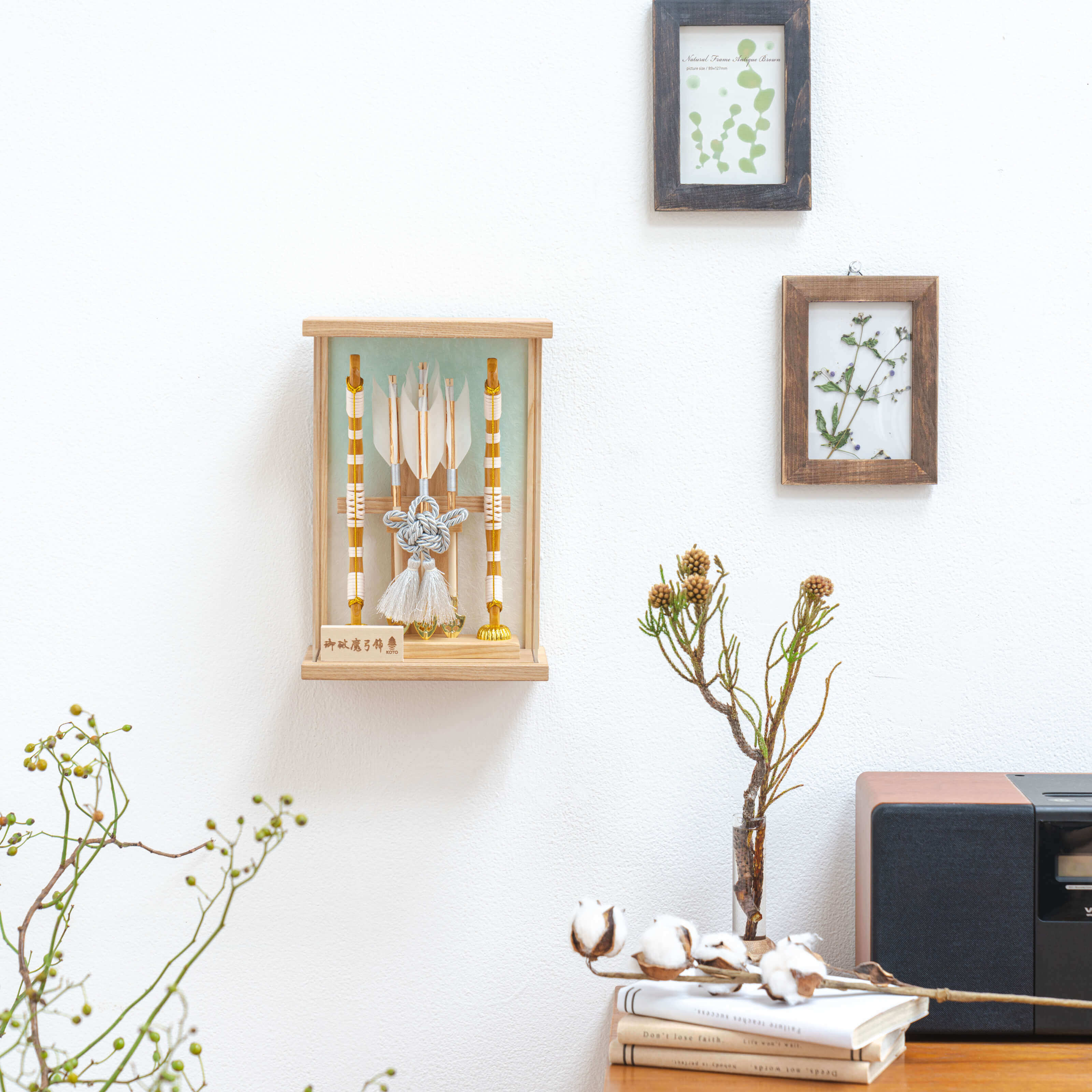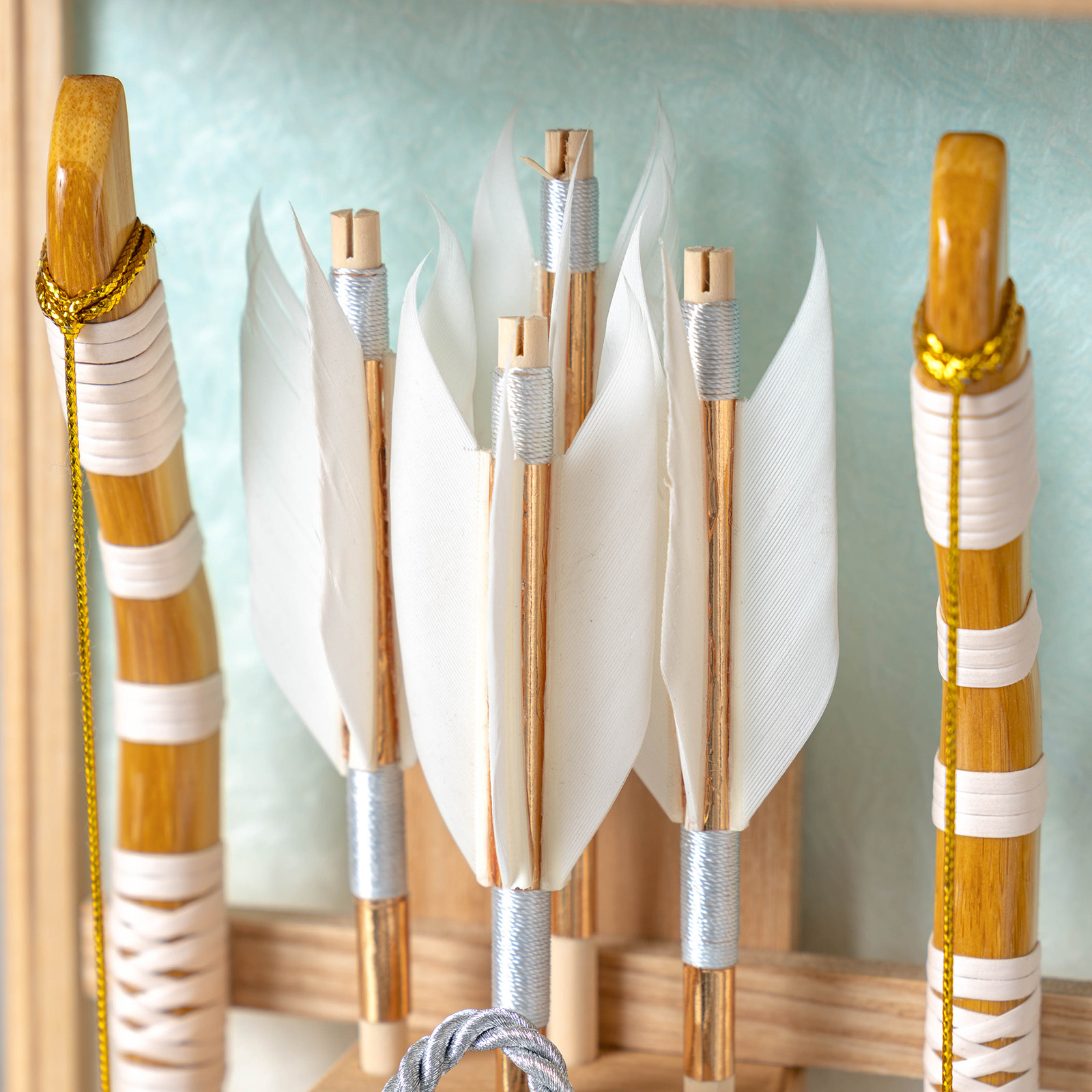 破魔弓は、魔よけ、厄払いのお守りです。男の子の元気な成長を願いお正月の縁起の祝い物となっています。古来からの行事であった新春の年占いや厄払いがその始まりです。男の子が弓矢で的を射て年占いをしたのがのちに破魔弓となりました。