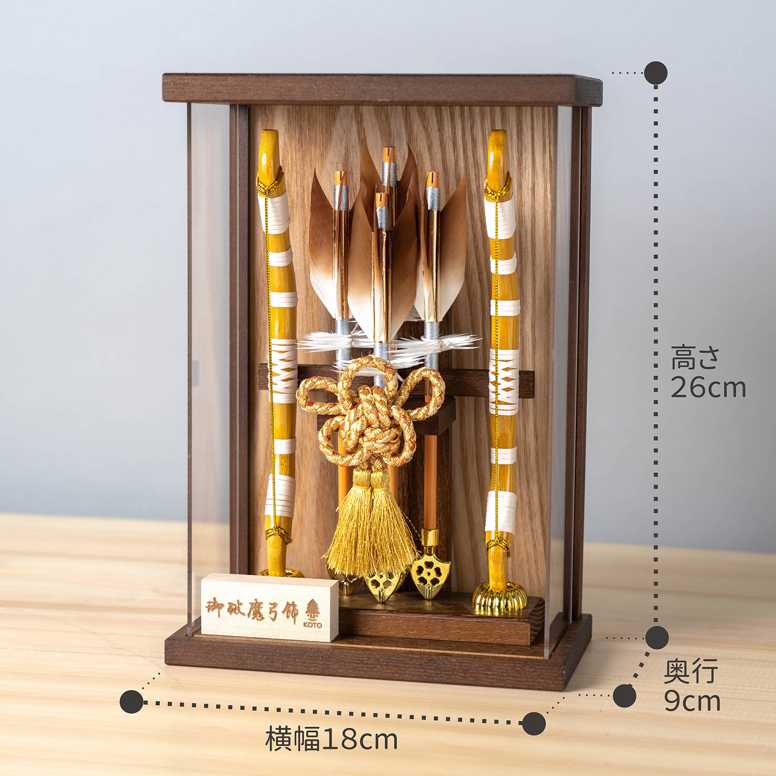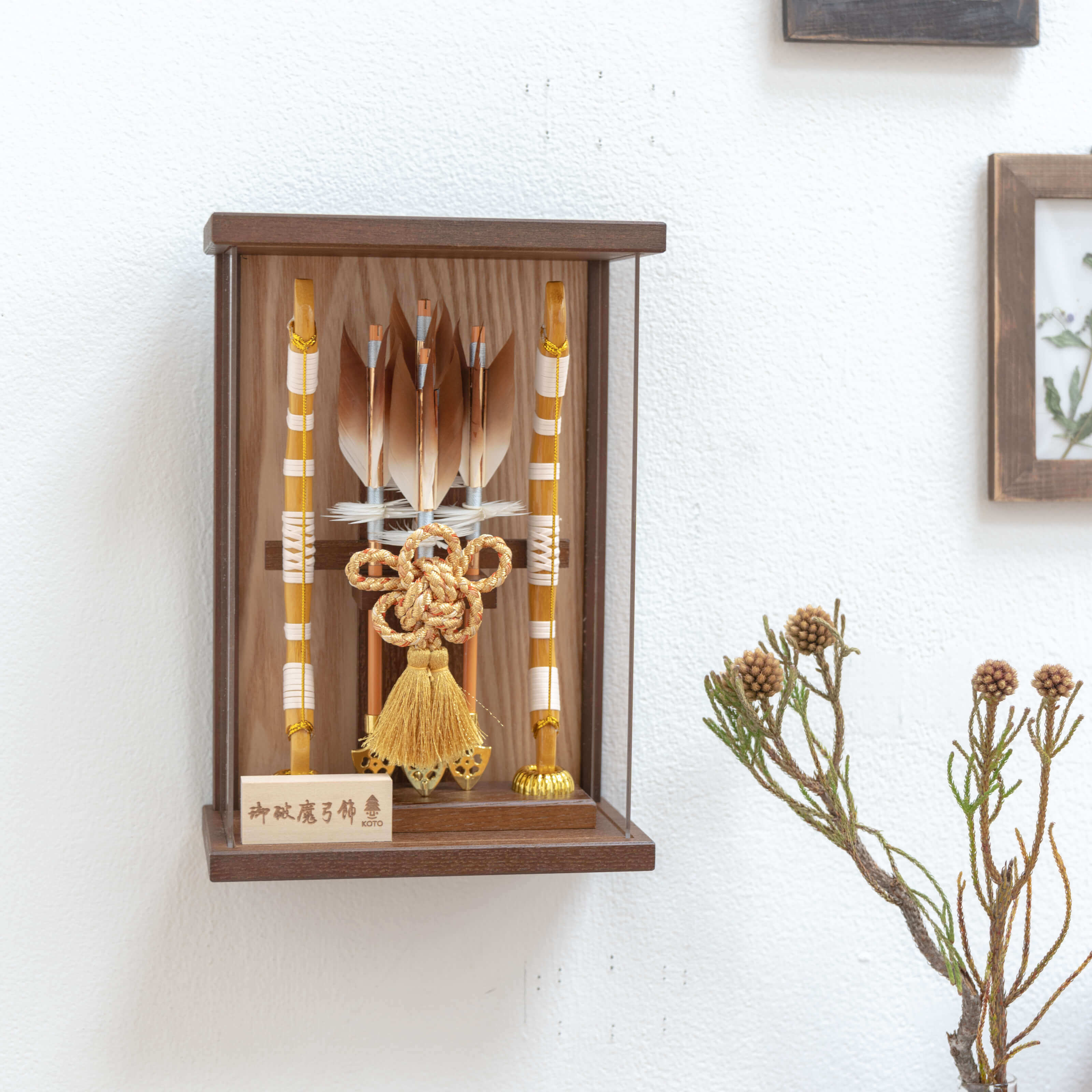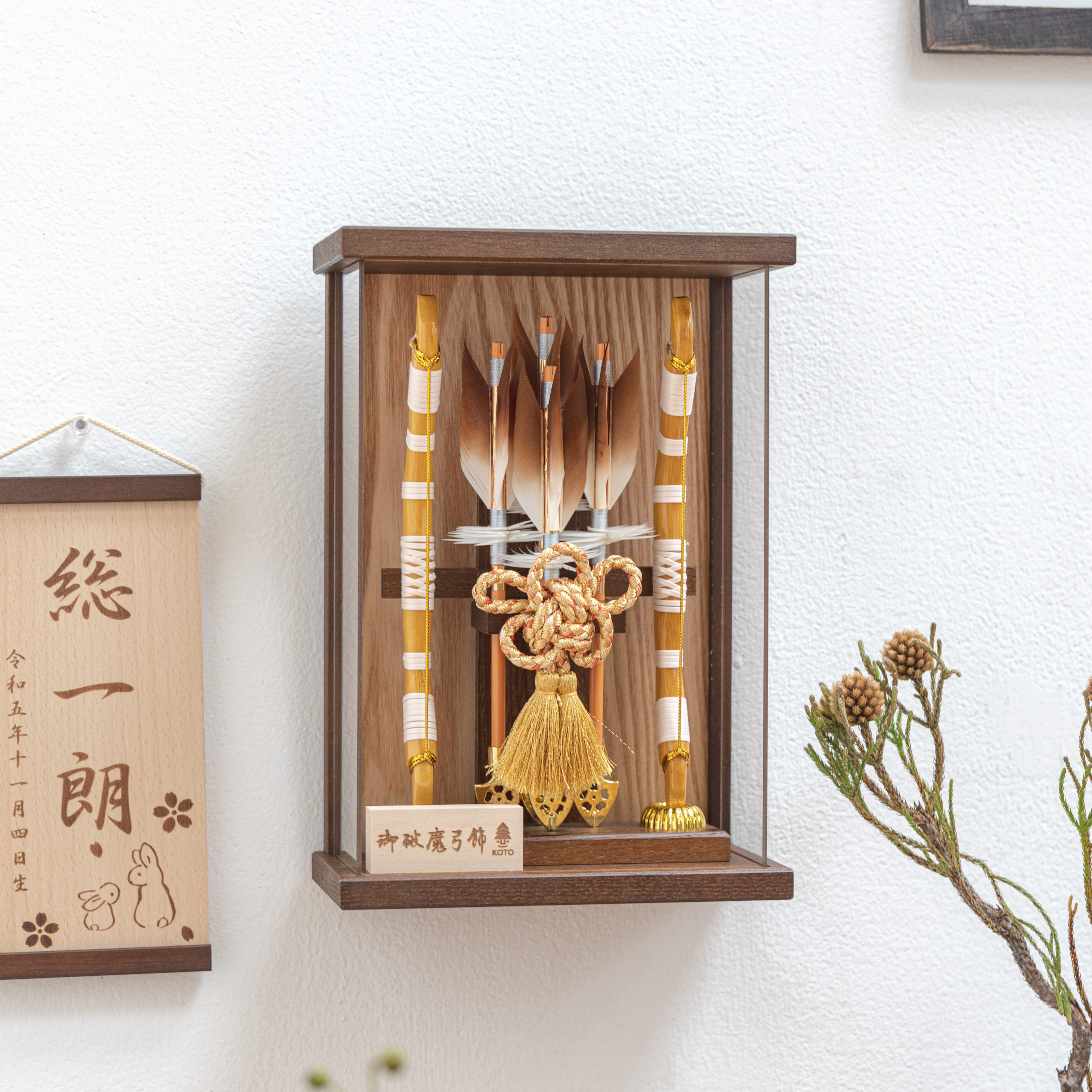 破魔弓は、魔よけ、厄払いのお守りです。男の子の元気な成長を願いお正月の縁起の祝い物となっています。古来からの行事であった新春の年占いや厄払いがその始まりです。男の子が弓矢で的を射て年占いをしたのがのちに破魔弓となりました。