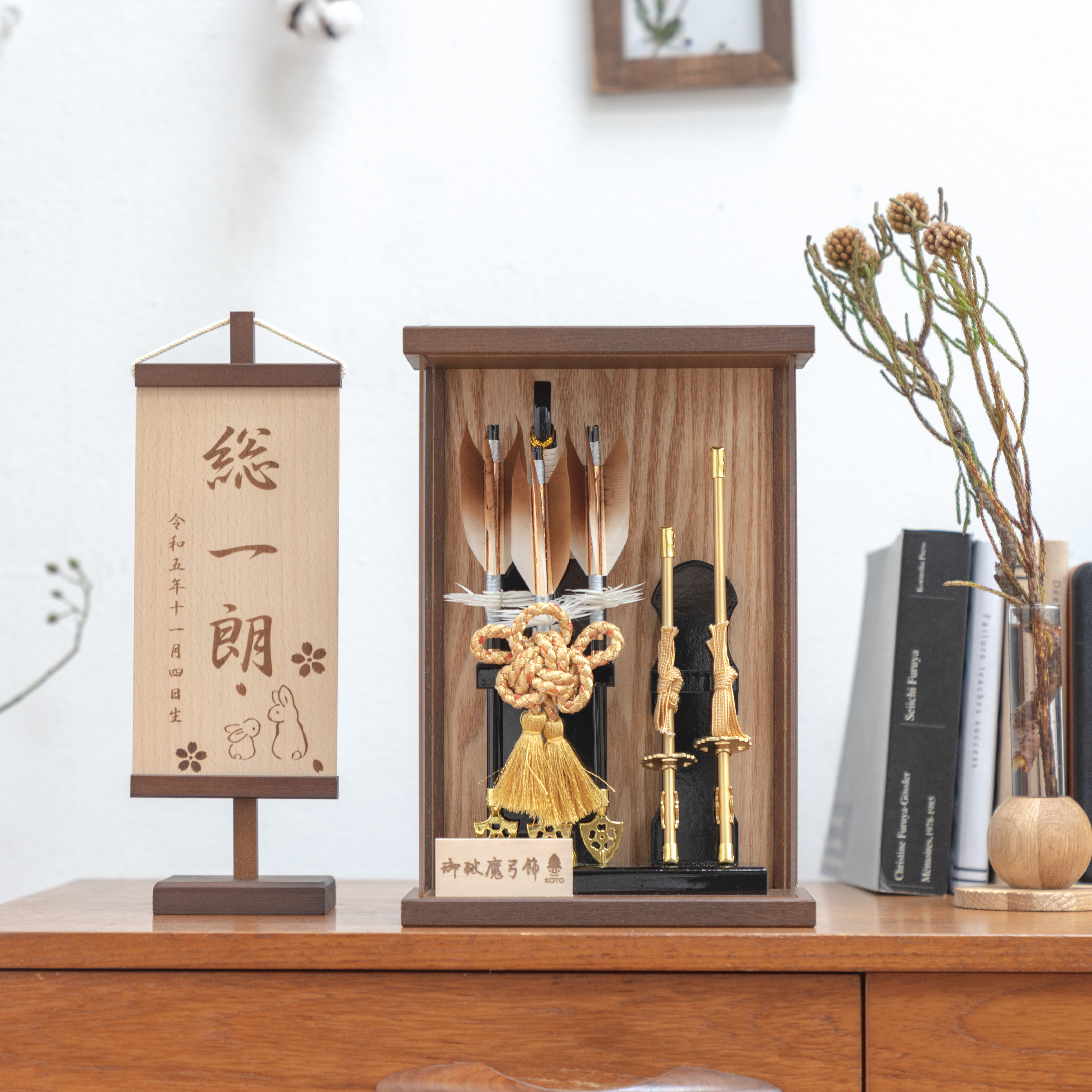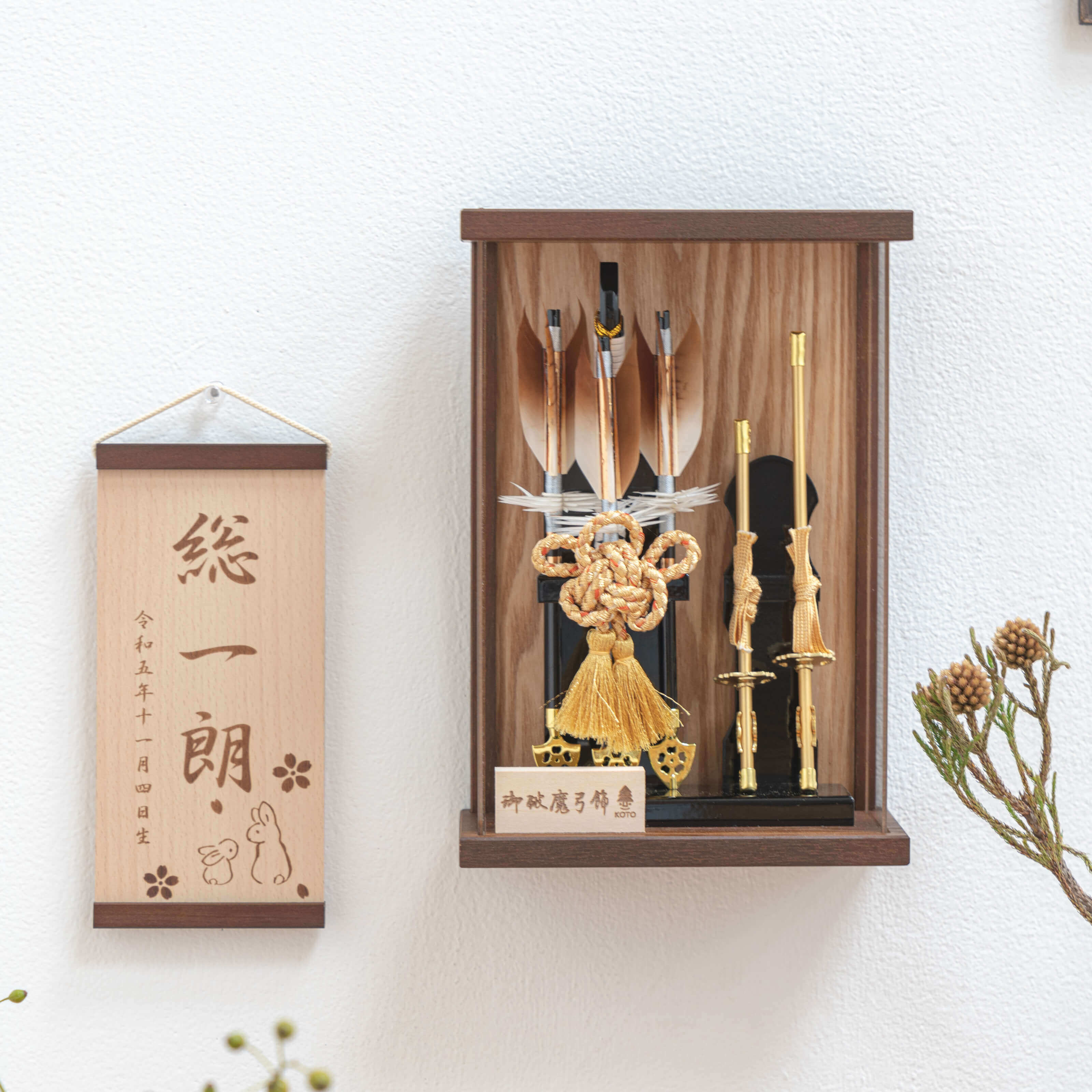 破魔弓は、魔よけ、厄払いのお守りです。男の子の元気な成長を願いお正月の縁起の祝い物となっています。古来からの行事であった新春の年占いや厄払いがその始まりです。男の子が弓矢で的を射て年占いをしたのがのちに破魔弓となりました。