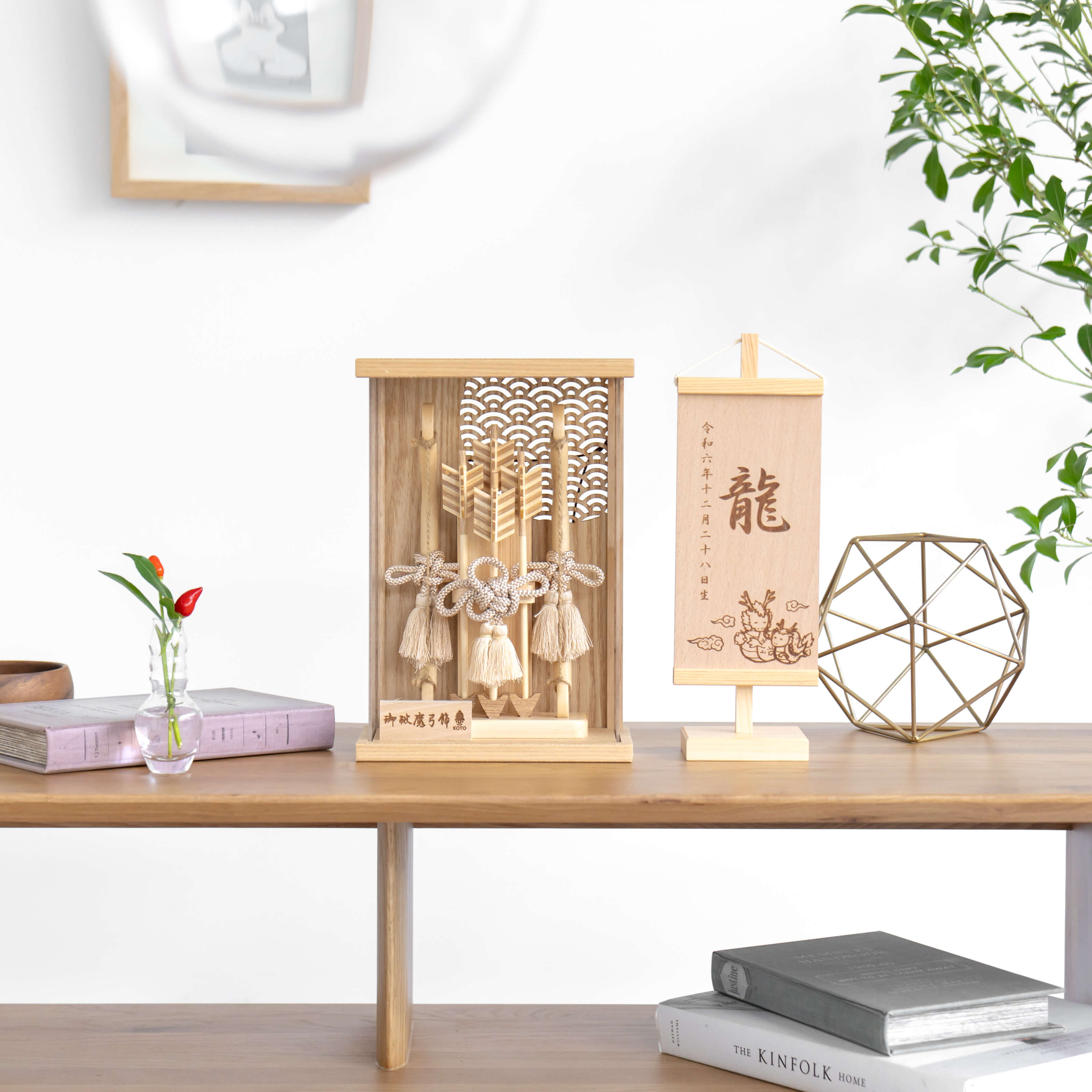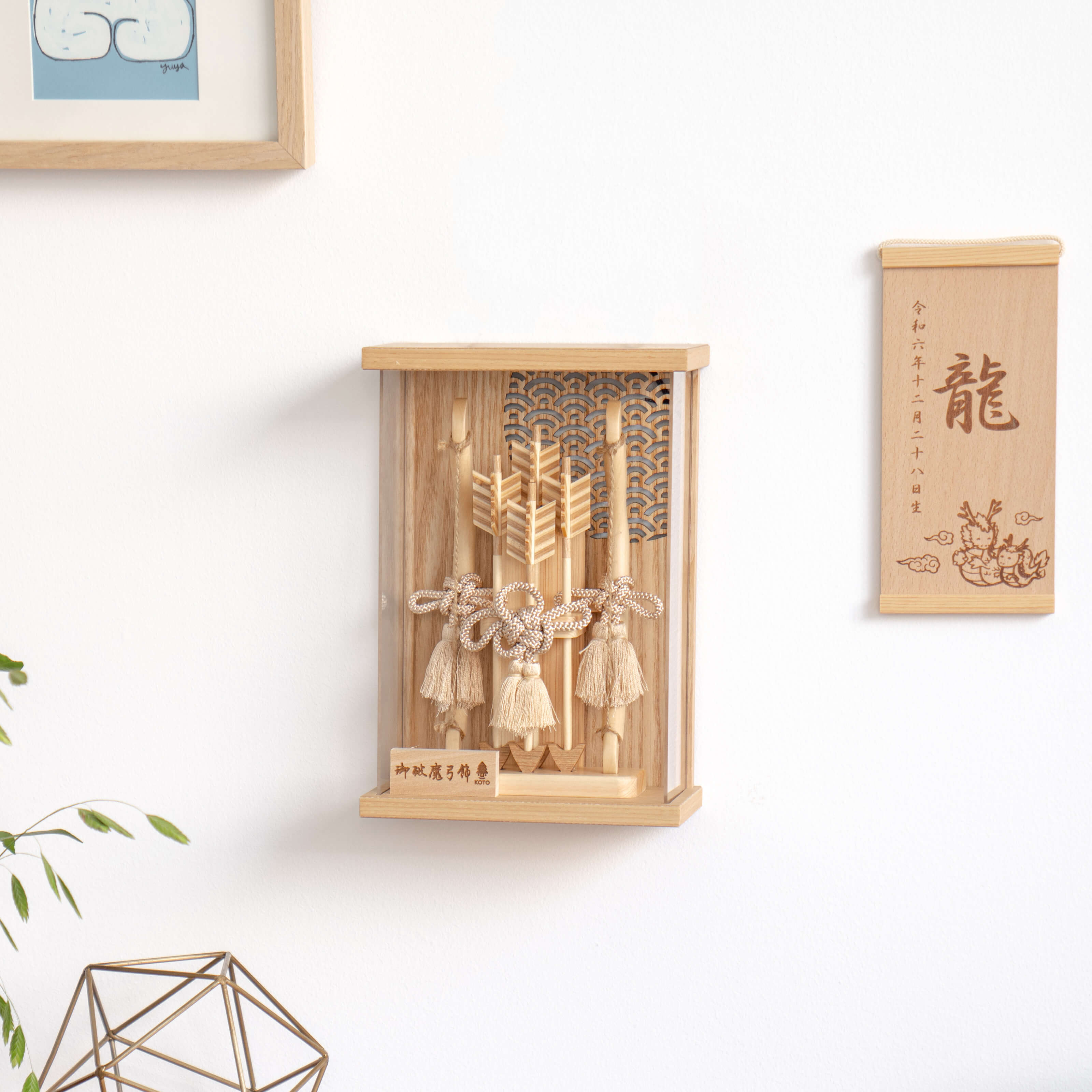 破魔弓は、魔よけ、厄払いのお守りです。男の子の元気な成長を願いお正月の縁起の祝い物となっています。古来からの行事であった新春の年占いや厄払いがその始まりです。男の子が弓矢で的を射て年占いをしたのがのちに破魔弓となりました。