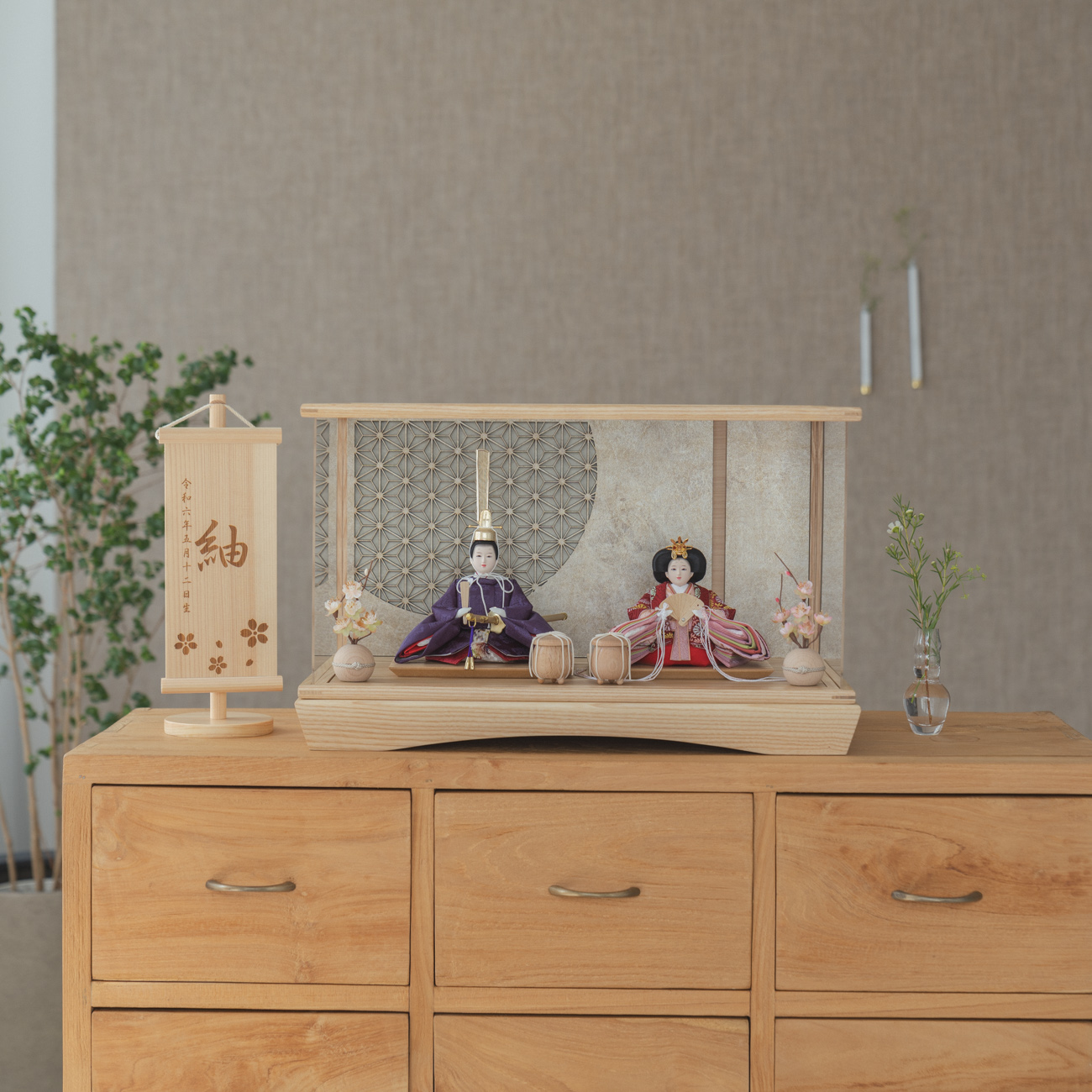 天然木の風合いを生かした木都の羽子板はひな人形と一緒に飾るのにぴったり。