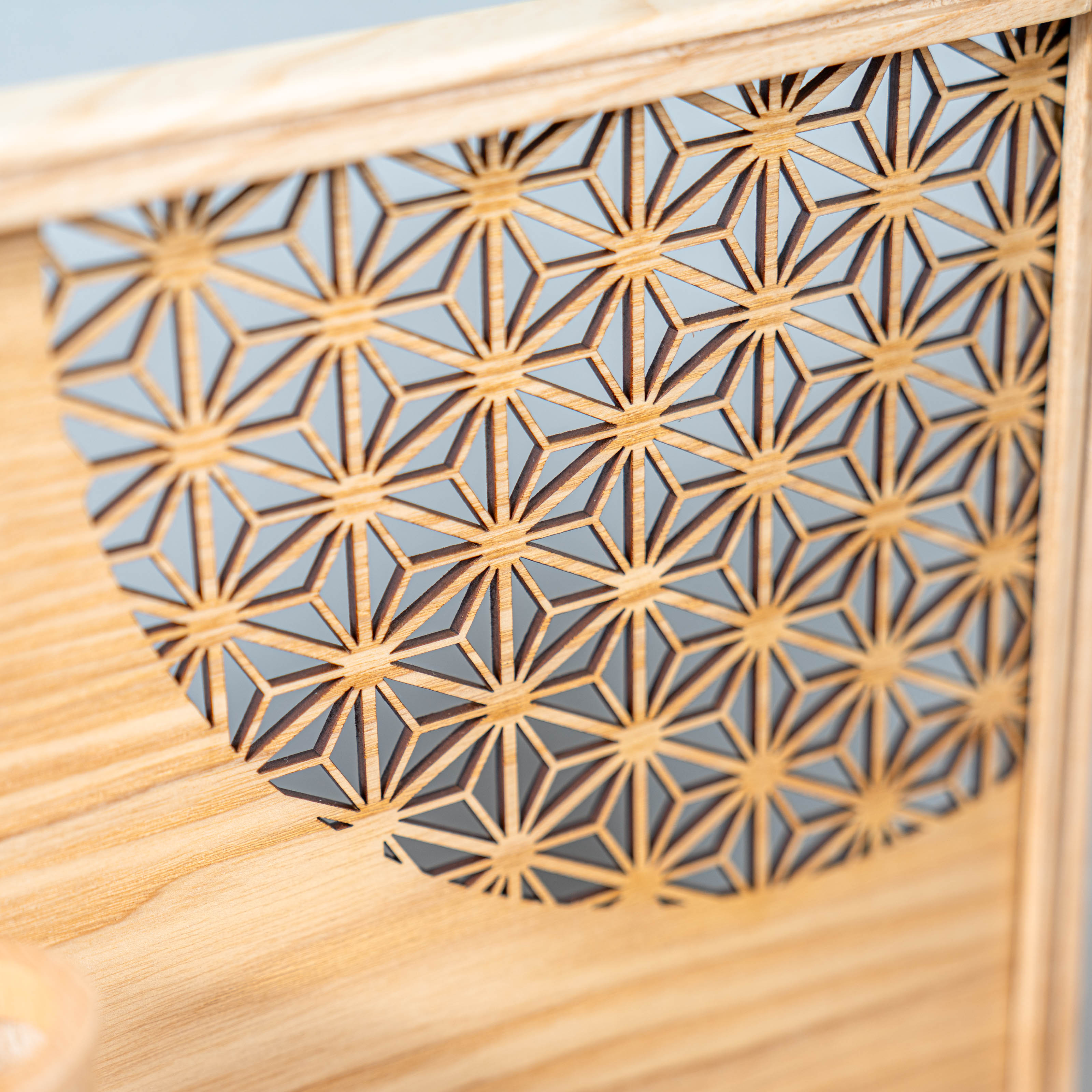 古来からの日本伝統の吉祥文様である麻の葉文様。麻の丈夫さ・成長の早さにあやかり、お子さまの健やかな成長への願いが込められています。