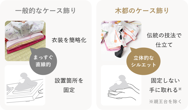 一般的なケース飾りの商品はコストや飾る手間を省くためにお人形の衣装を簡略化したり、設置箇所が固定されていますが、木都のお人形は伝統的な技法でお仕立てをし、親王台以外の設置箇所をあえて固定しておりません。