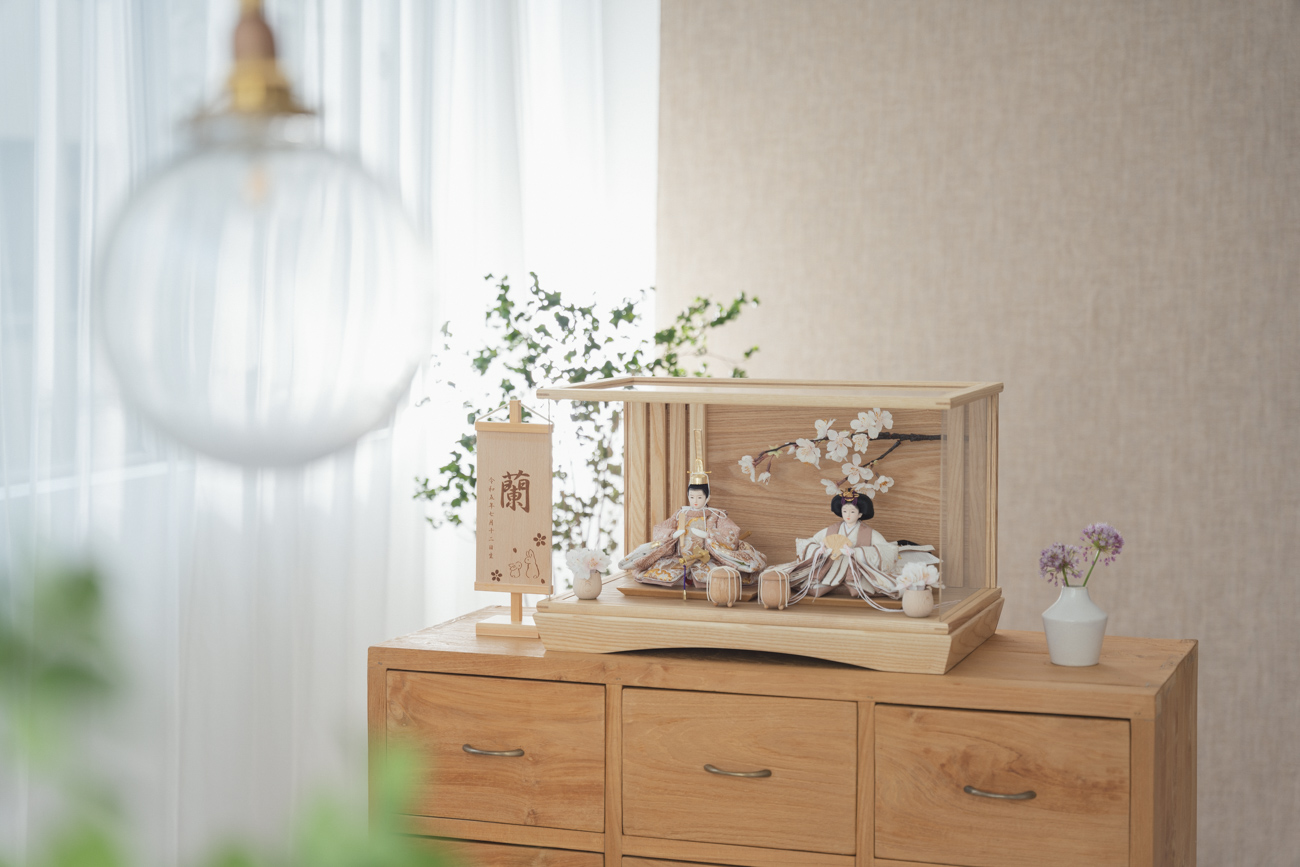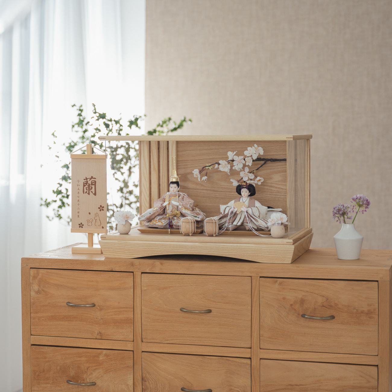 伝統工芸の技術、裏側や後ろ側、内部の見えない箇所や素材にまでこだわり抜いたひな人形。道具も木のぬくもりを感じて頂くために無垢材を使用しております。