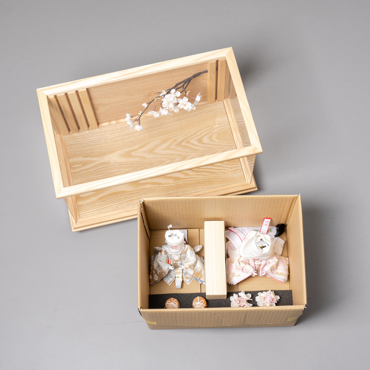 伝統工芸の技術、裏側や後ろ側、内部の見えない箇所や素材にまでこだわり抜いたひな人形。道具も木のぬくもりを感じて頂くために無垢材を使用しております。