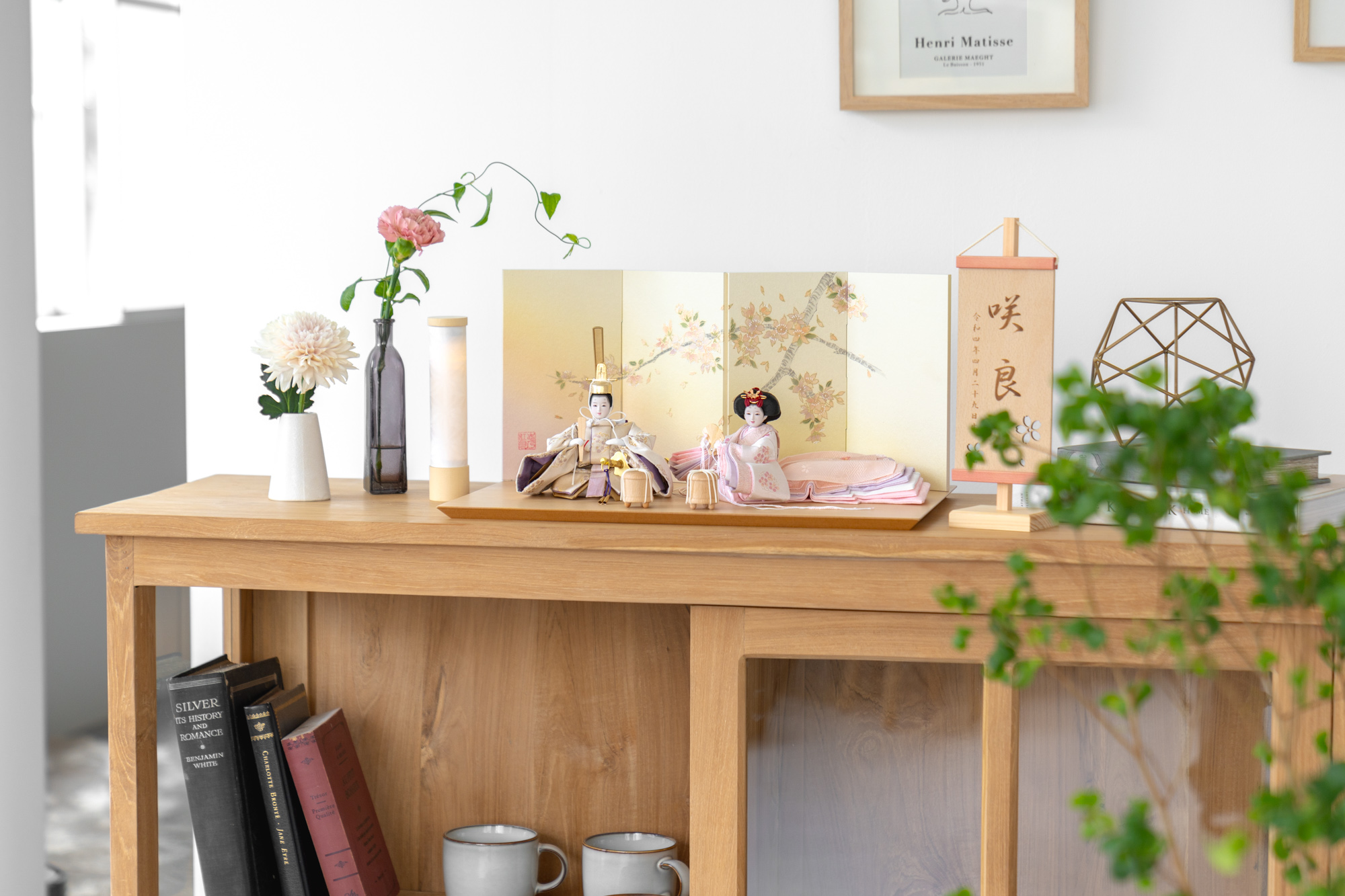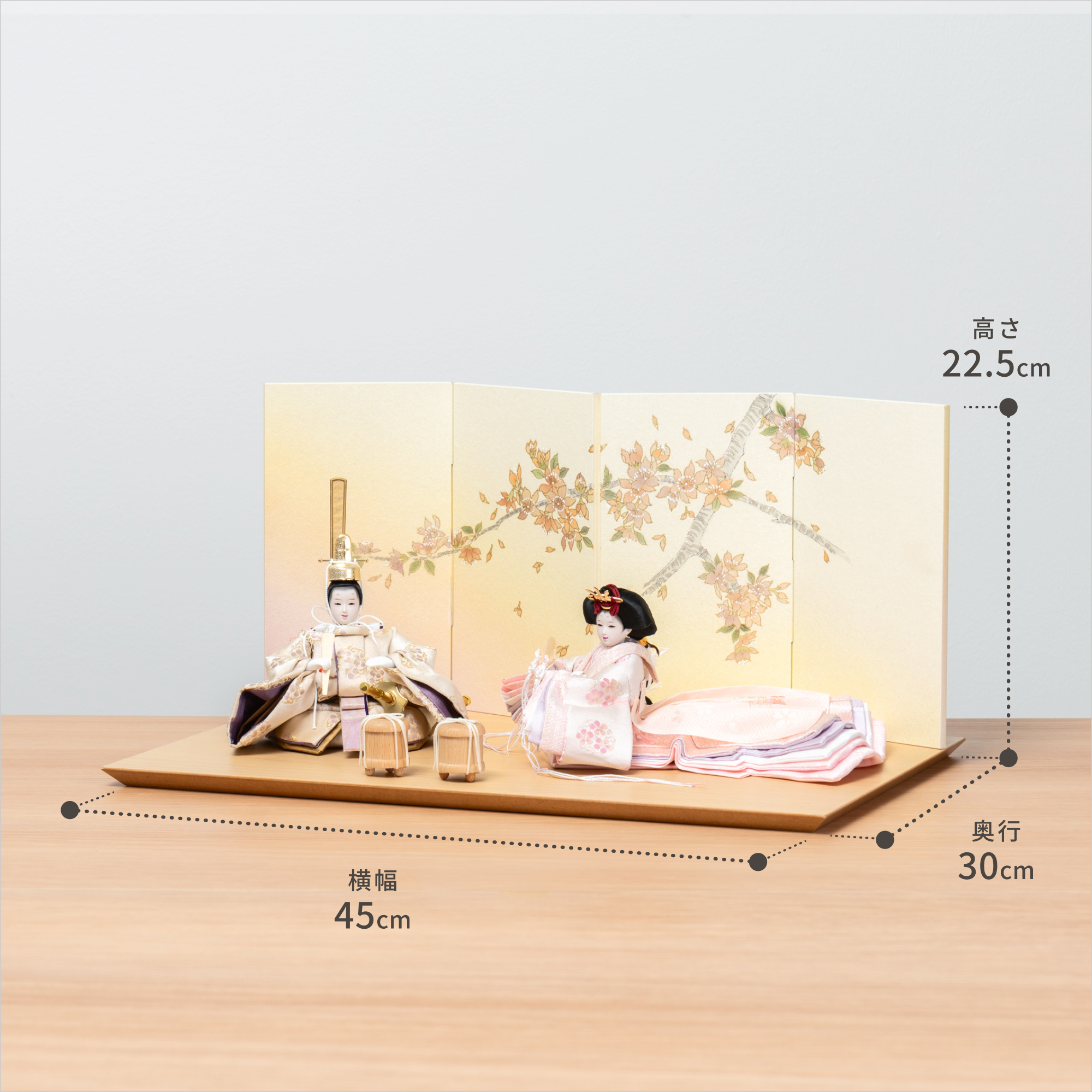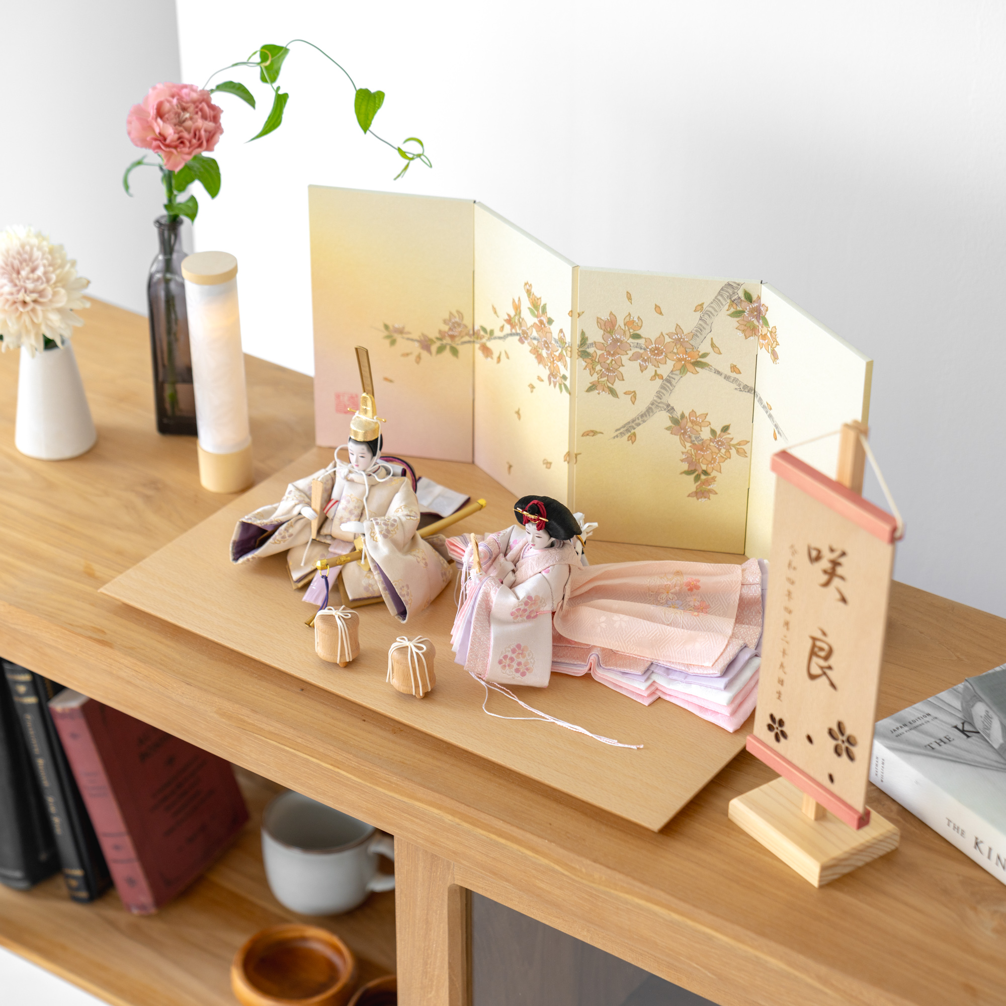 一般的な親王の形とは違い、お姫様の着物の裾を長くし、平安絵巻のような流れる動きをつけました。横向きに飾ることで、衣装と裾重ねの色の美しさを同時に楽しんでいただけます。