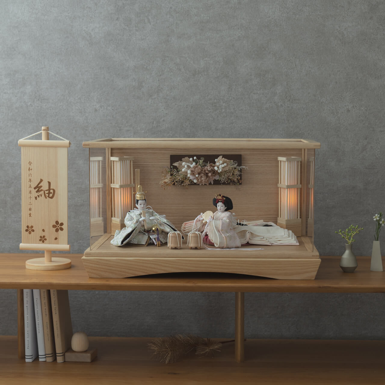 天然木の風合いを生かした木都の羽子板はひな人形と一緒に飾るのにぴったり。