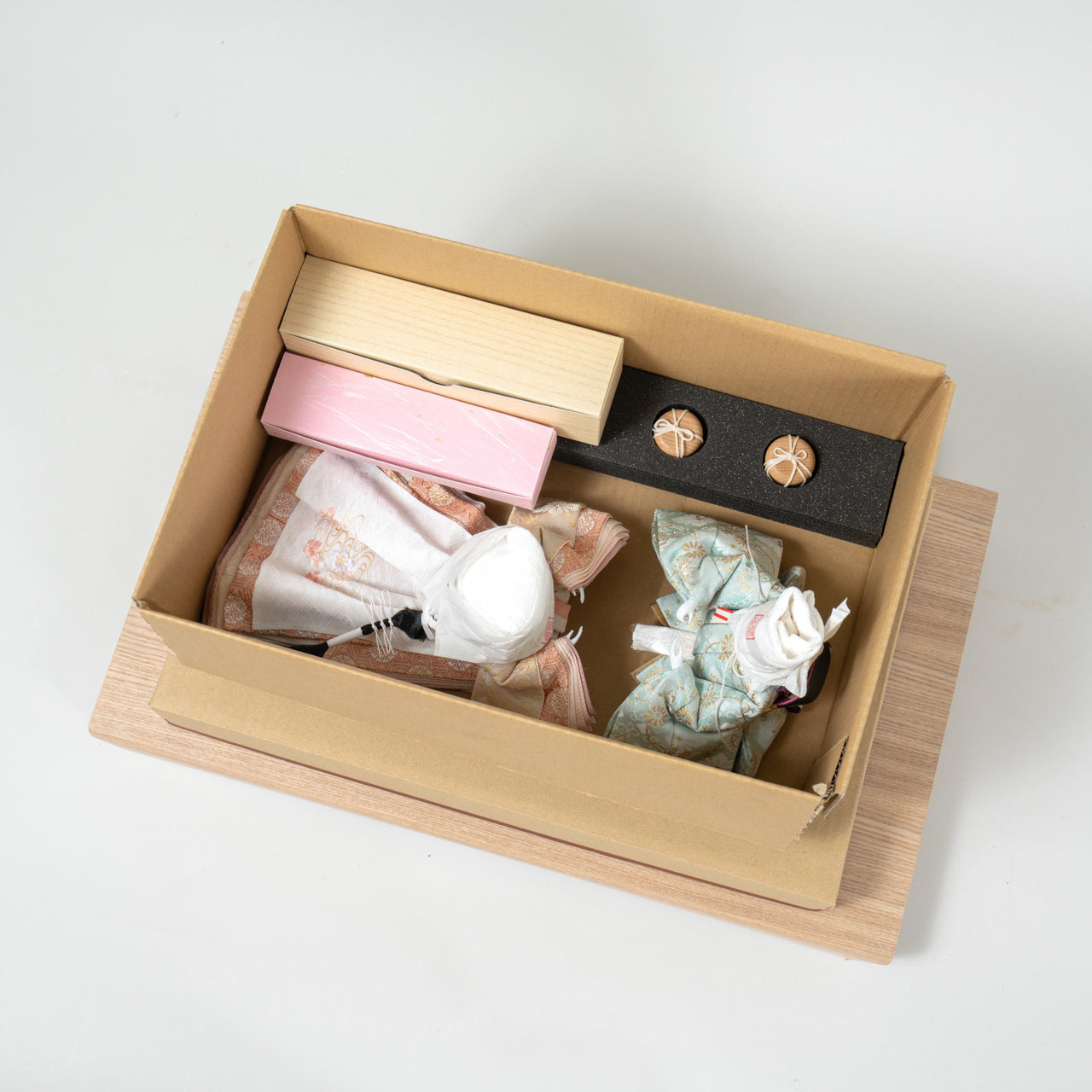 一般的なケース飾りの商品はコストや飾る手間を省くためにお人形の衣装を簡略化したり、設置箇所が固定されていますが、木都のお人形は伝統的な技法でお仕立てをし、親王台以外の設置箇所をあえて固定しておりません。