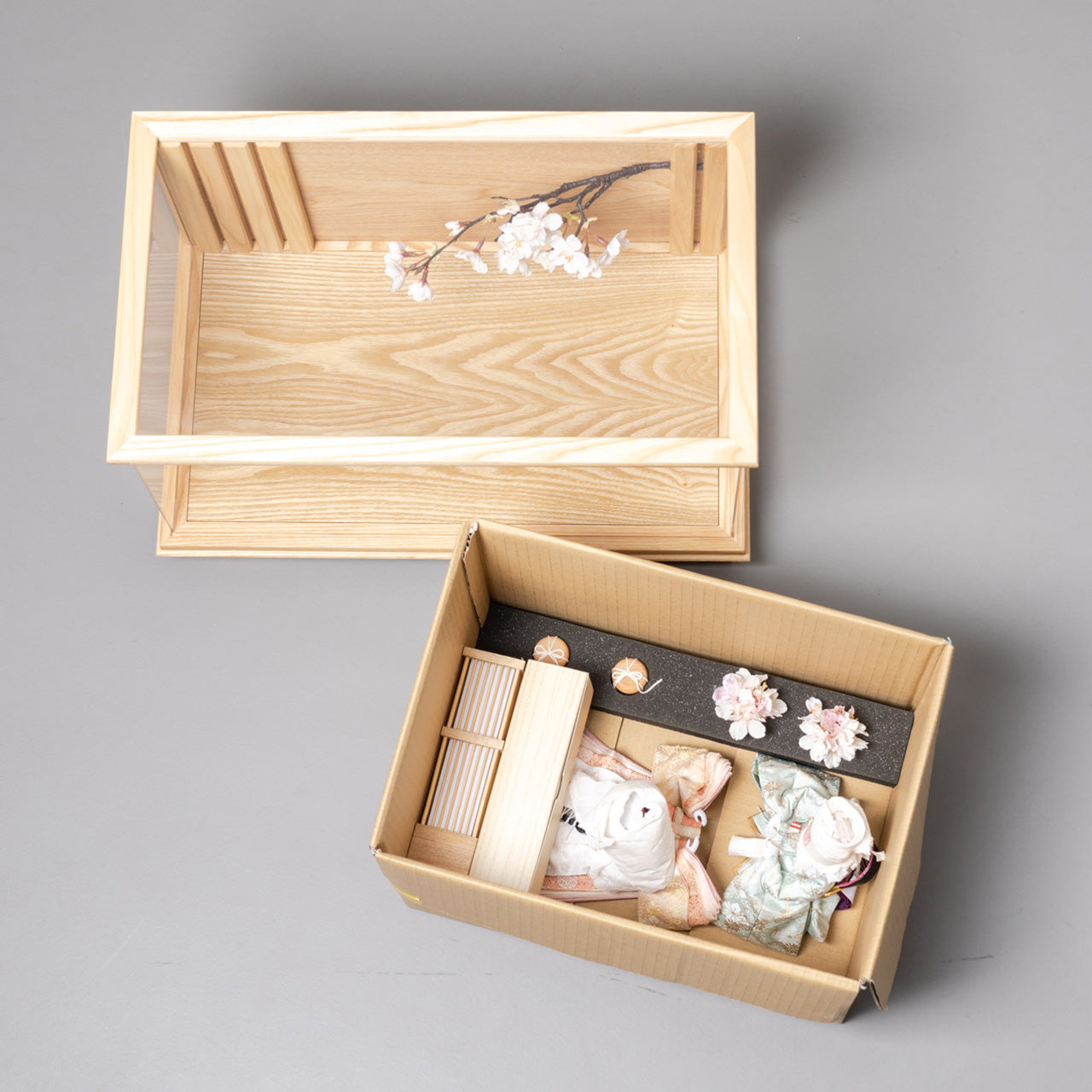 一般的なケース飾りの商品はコストや飾る手間を省くためにお人形の衣装を簡略化したり、設置箇所が固定されていますが、木都のお人形は伝統的な技法でお仕立てをし、親王台以外の設置箇所をあえて固定しておりません。