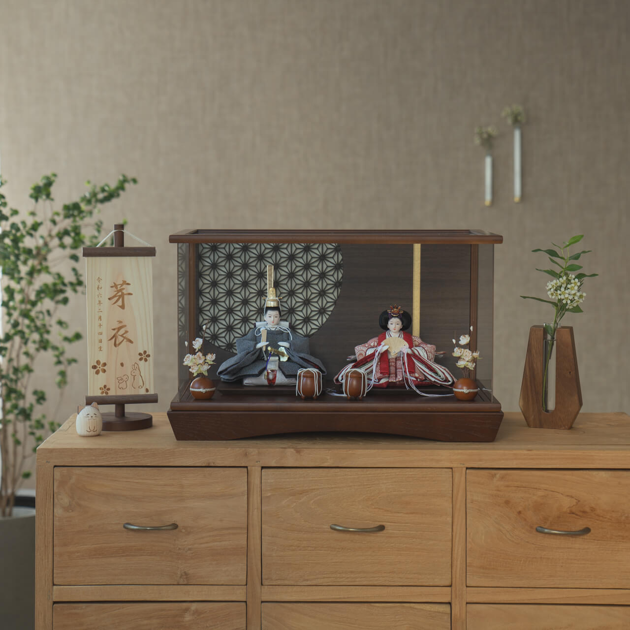 天然木の風合いを生かした木都の羽子板はひな人形と一緒に飾るのにぴったり。