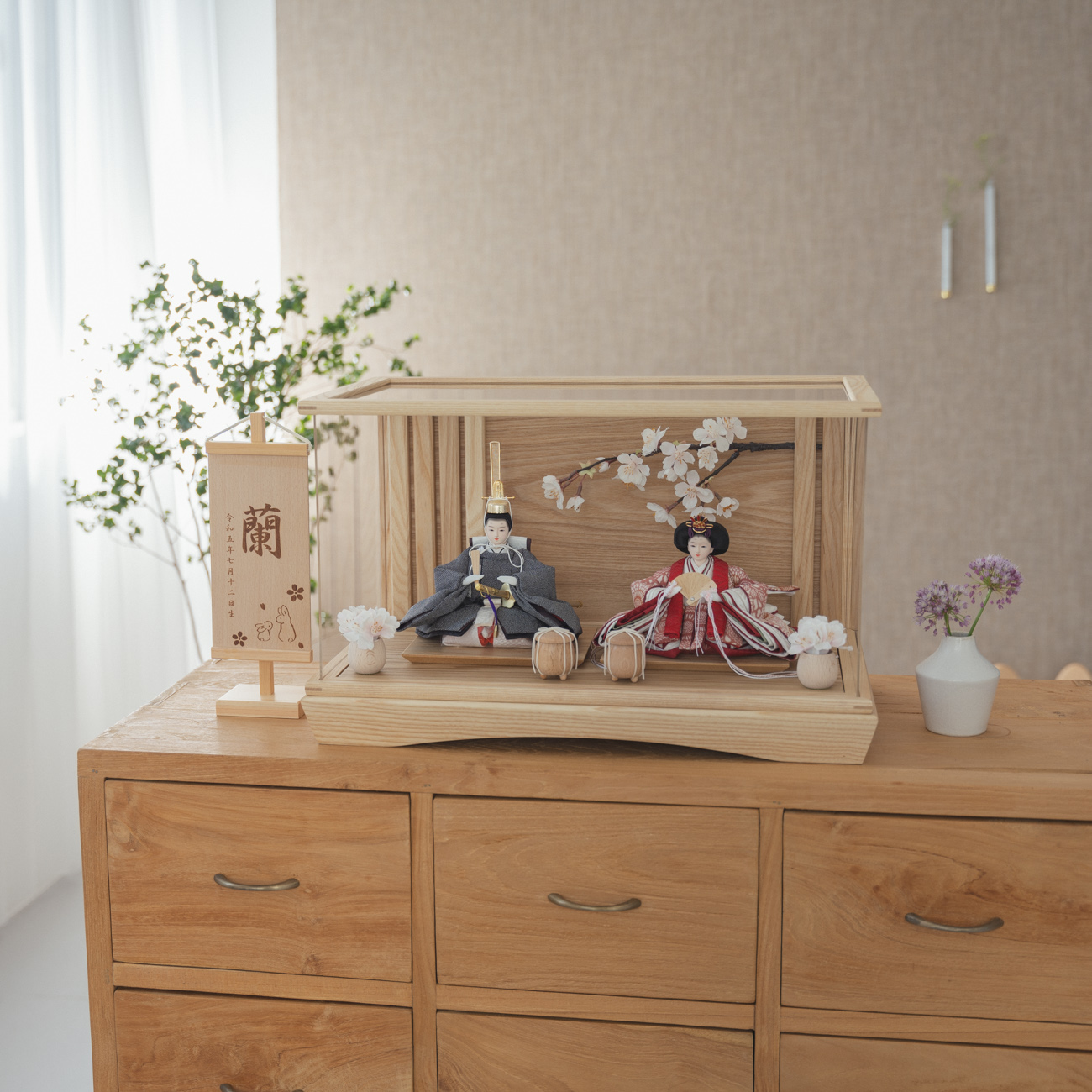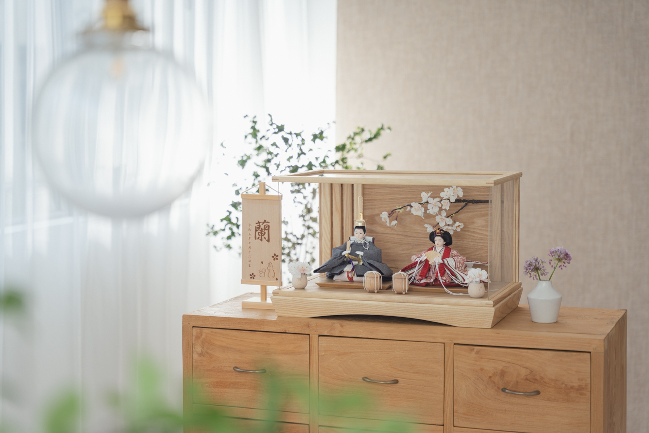 伝統工芸の技術、裏側や後ろ側、内部の見えない箇所や素材にまでこだわり抜いたひな人形。道具も木のぬくもりを感じて頂くために無垢材を使用しております。