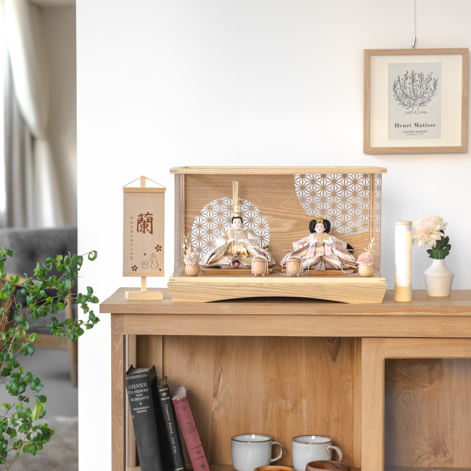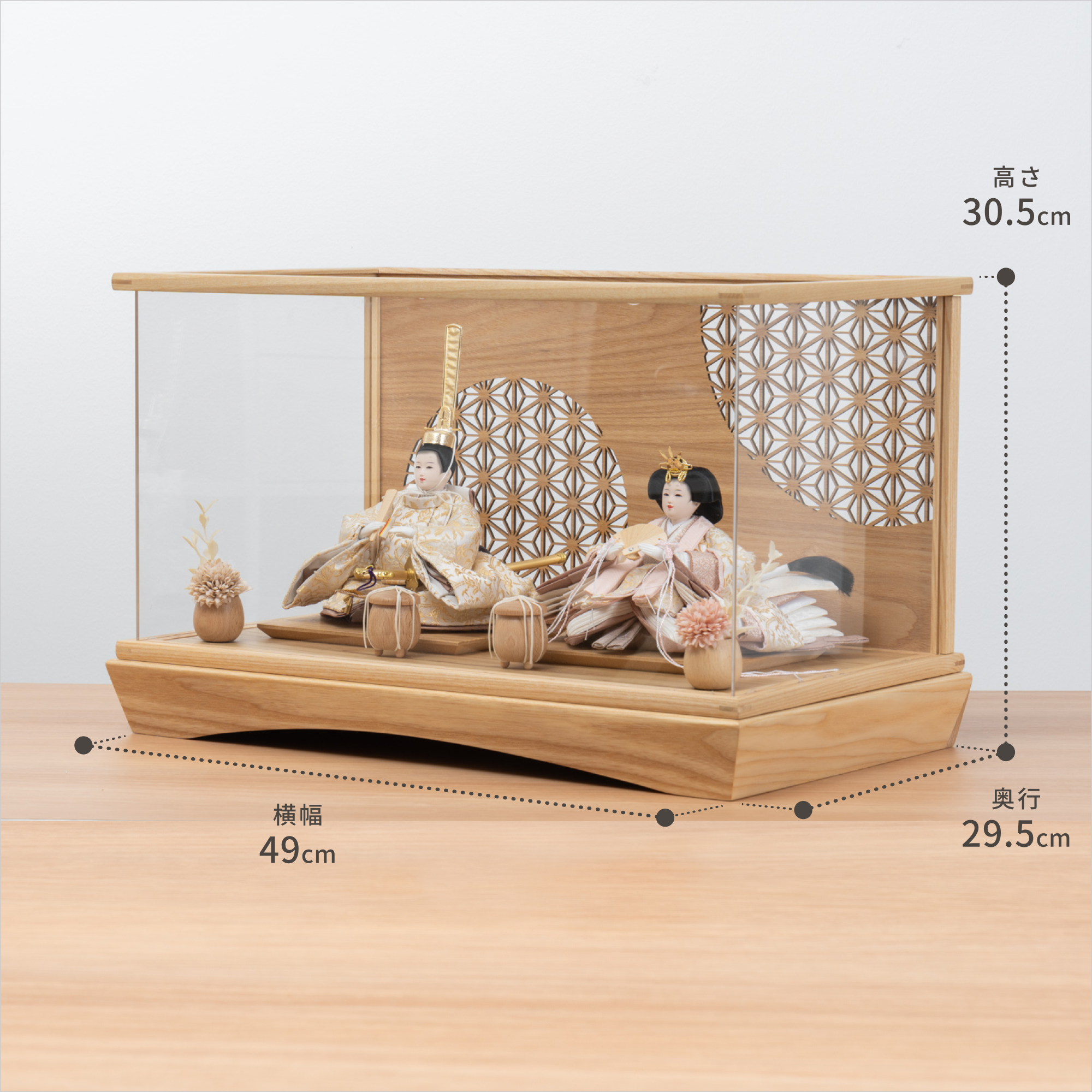伝統工芸の技術、裏側や後ろ側、内部の見えない箇所や素材にまでこだわり抜いたひな人形。道具も木のぬくもりを感じて頂くために無垢材を使用しております。
