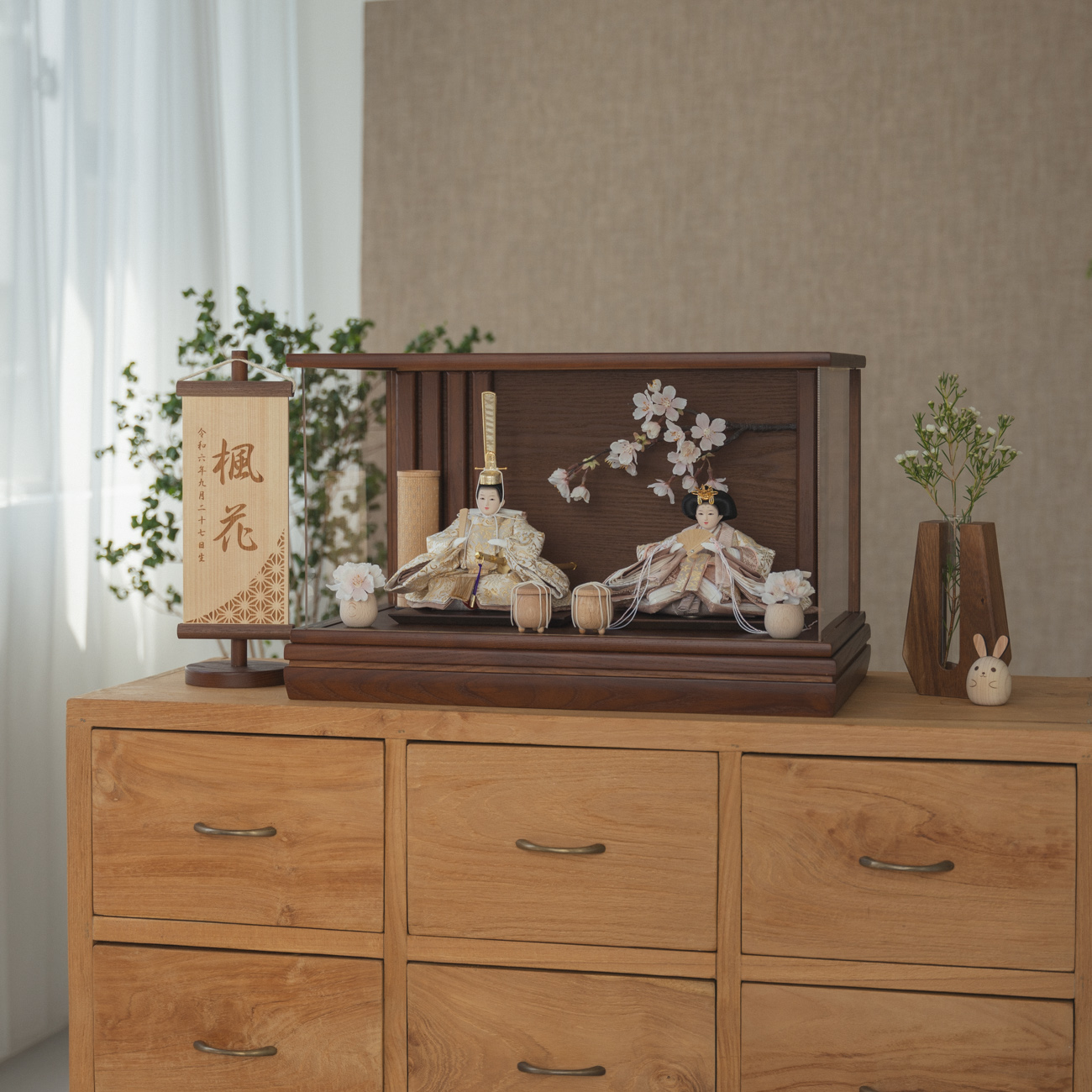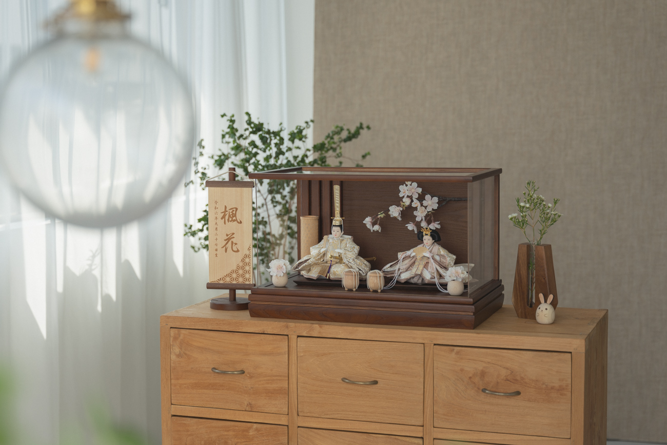 ケースでも手にとって欲しいこだわりのひな人形 伝統工芸の技術、裏側や後ろ側、内部の見えない箇所や素材にまでこだわり抜いたひな人形。道具も木のぬくもりを感じて頂くために無垢材を使用しております。