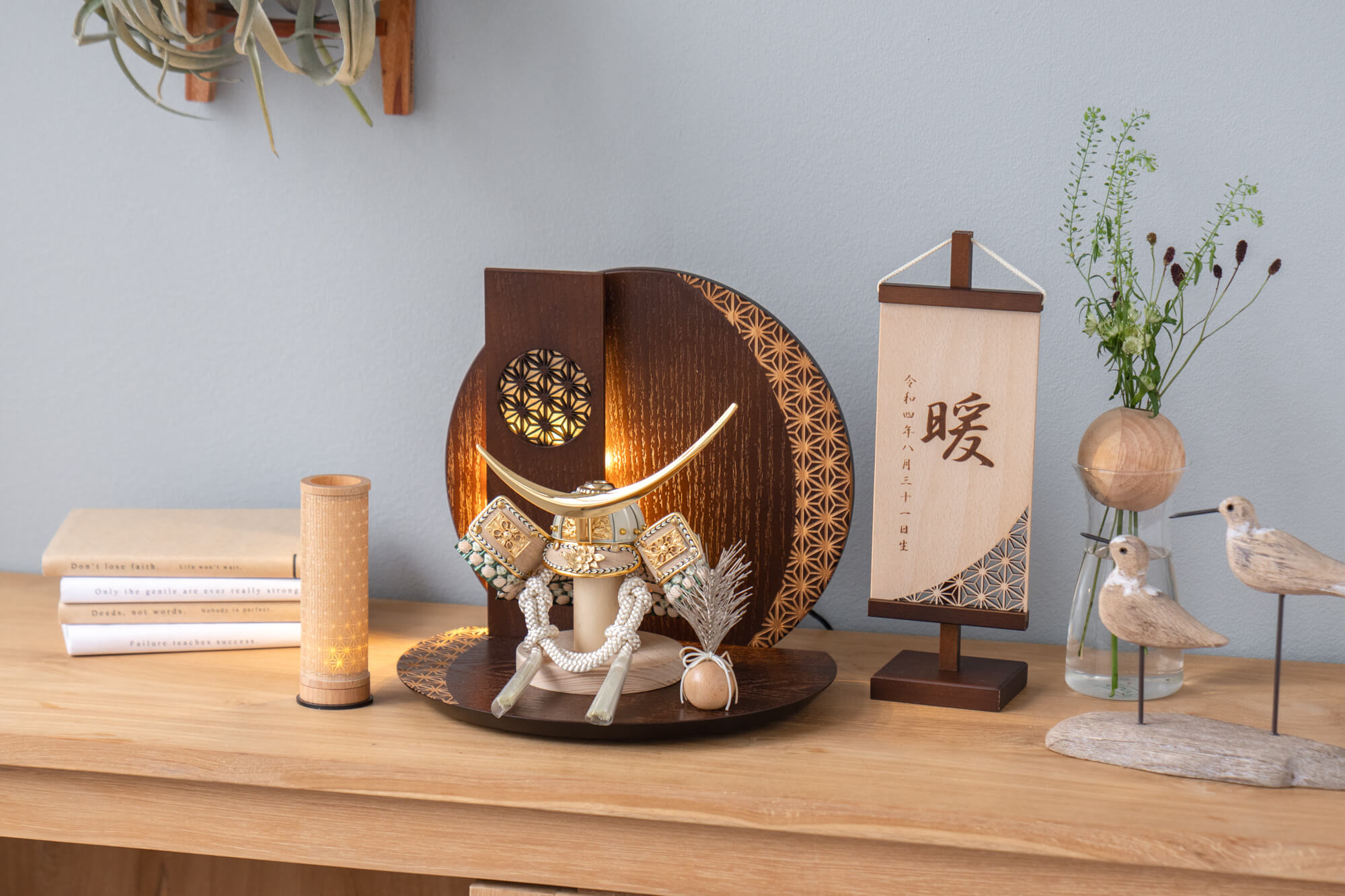 天然木の風合いを生かした木都の破魔弓は五月人形と一緒に飾るのにぴったり。